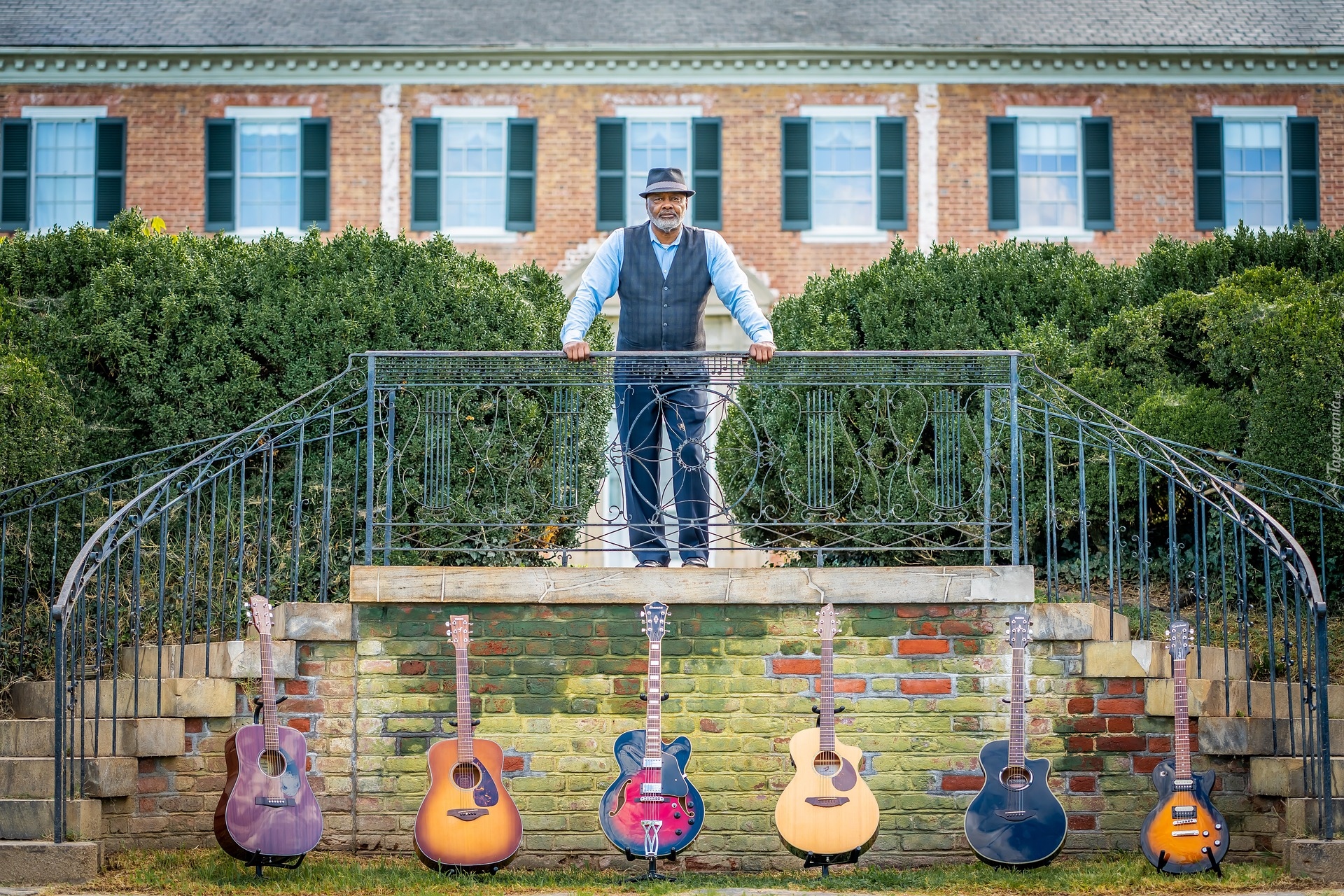 Edytor tapety: Mężczyzna oparty o balustradę i gitary pod tarasem