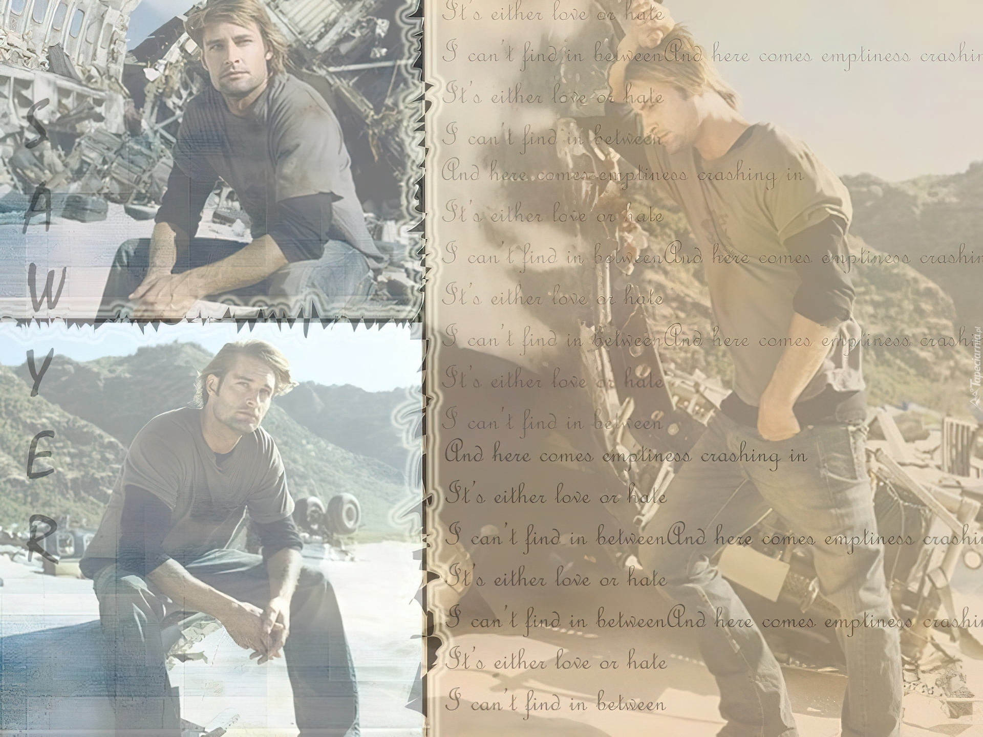 Edytor tapety: Serial, Lost, Zagubieni, Josh Holloway, rozbity, samolot, napisy