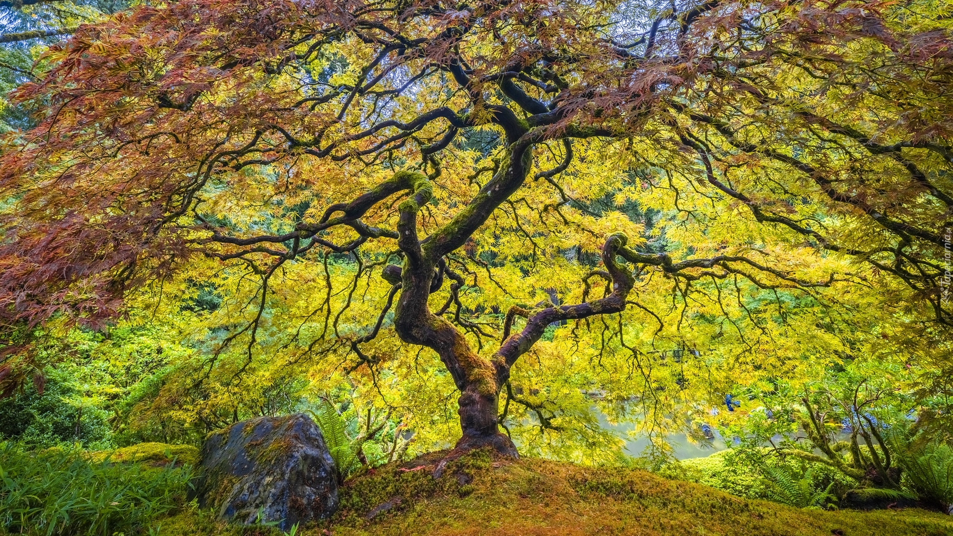 Edytor tapety: Kamień pod klonem palmowym w ogrodzie