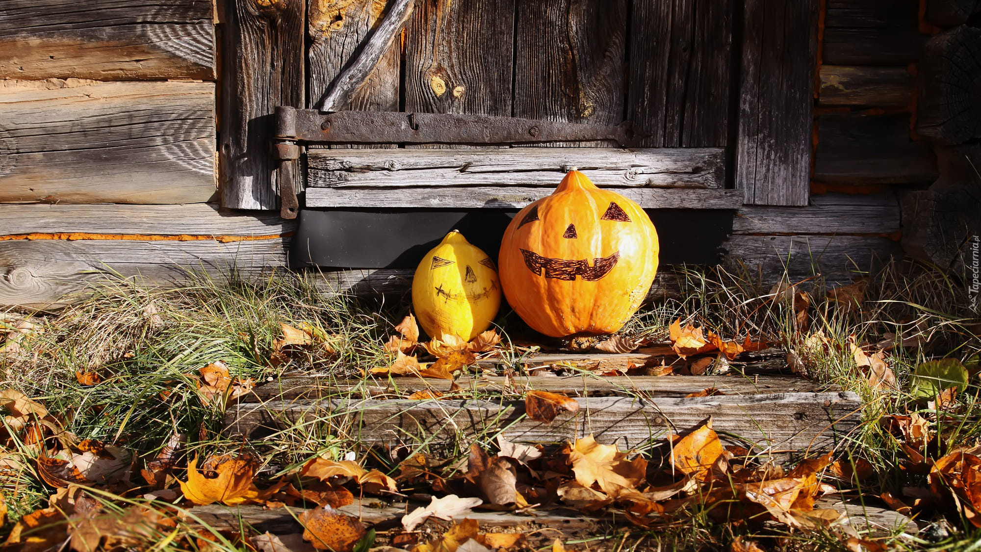 Edytor tapety: Dynie przy drewnianych drzwiach