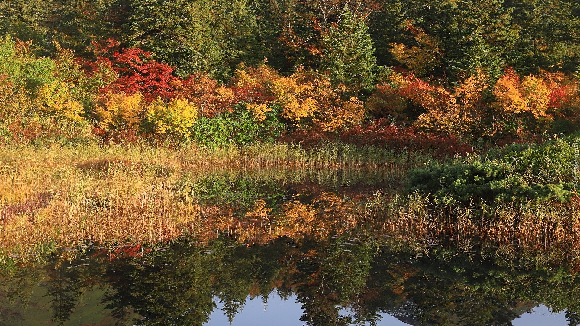 Edytor tapety: Kolorowe drzewa nad brzegiem stawu