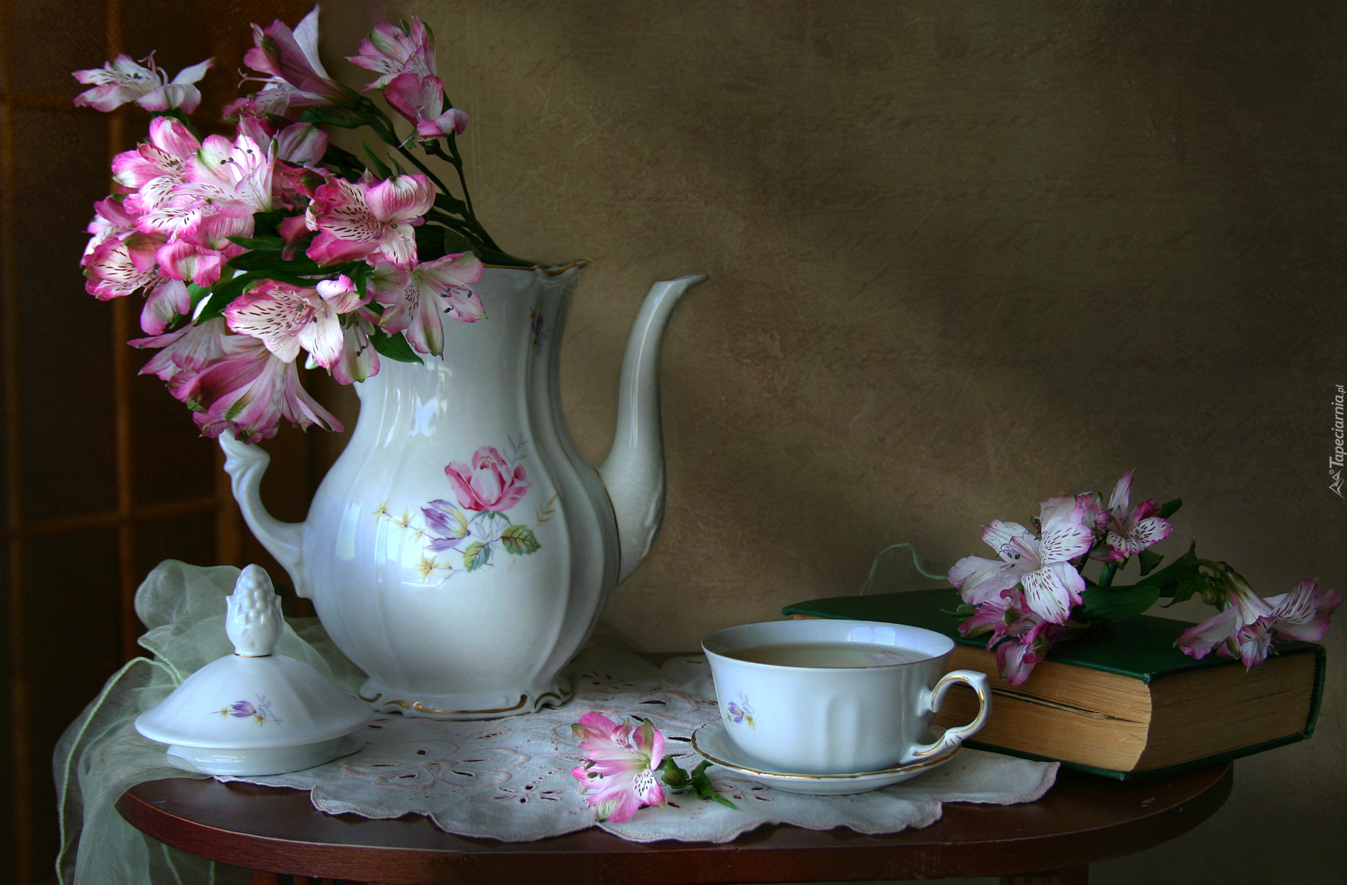 Edytor tapety: Alstremerie w dzbanku obok filiżanki i książki