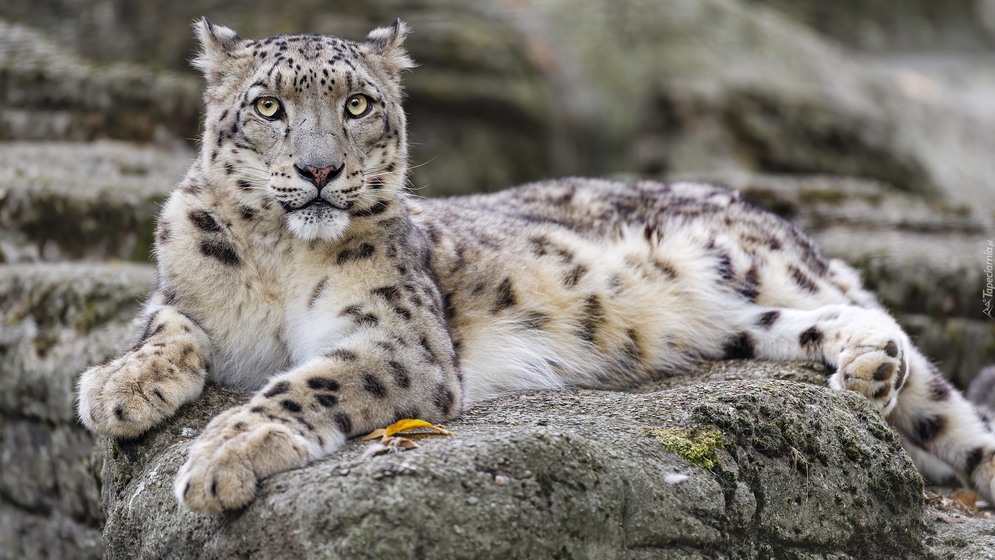 Edytor tapety: Odpoczywający irbis śnieżny na skale