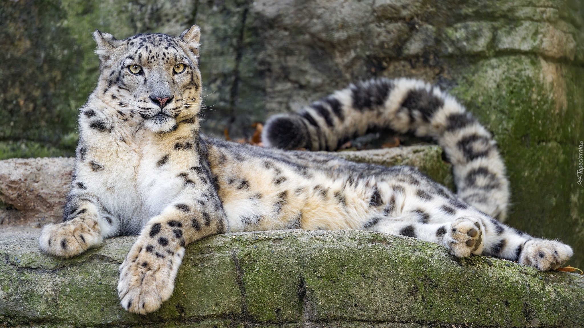 Edytor tapety: Irbis śnieżny odpoczywający na skałach