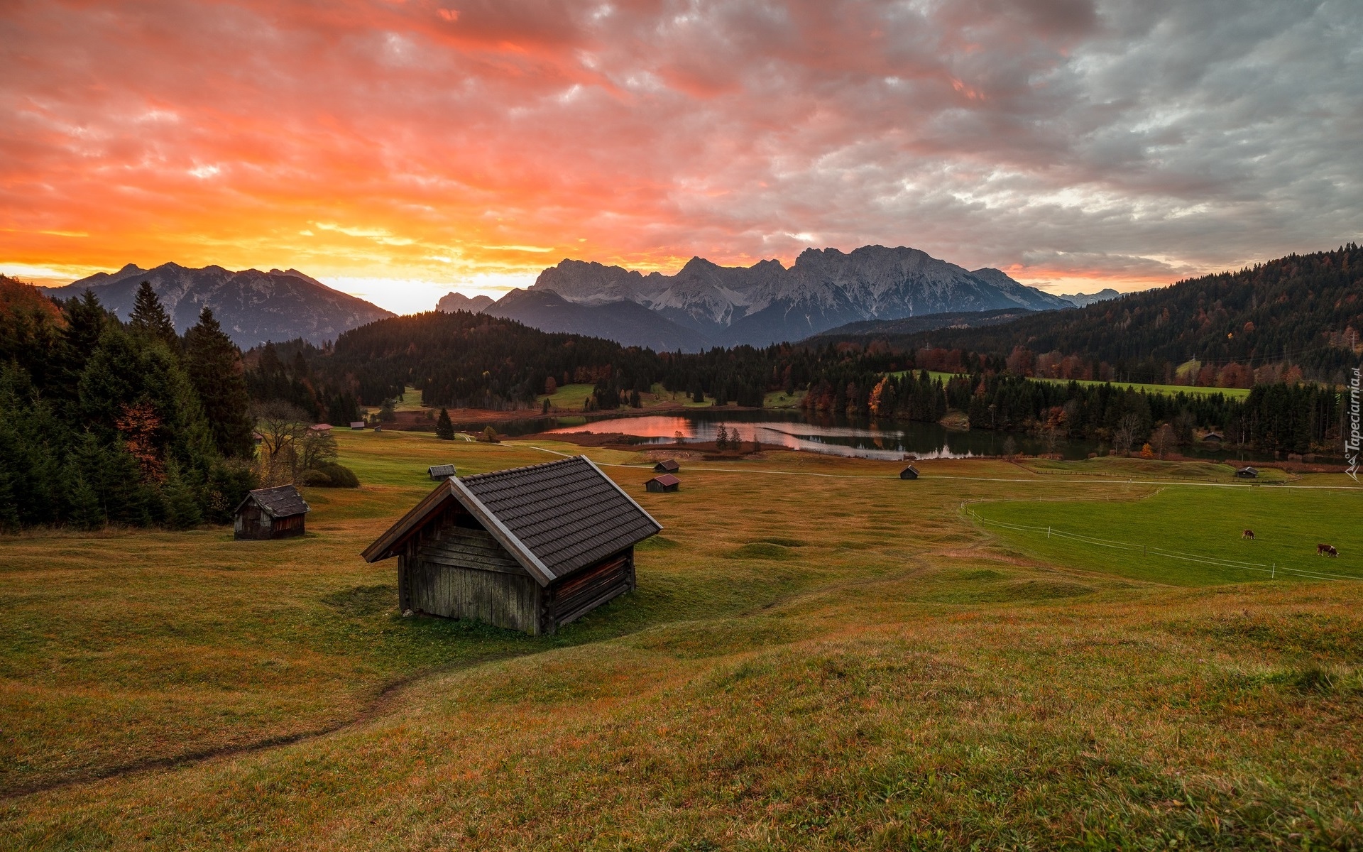 Edytor tapety: Szopy na polanie niedaleko jeziora Geroldsee w Bawarii