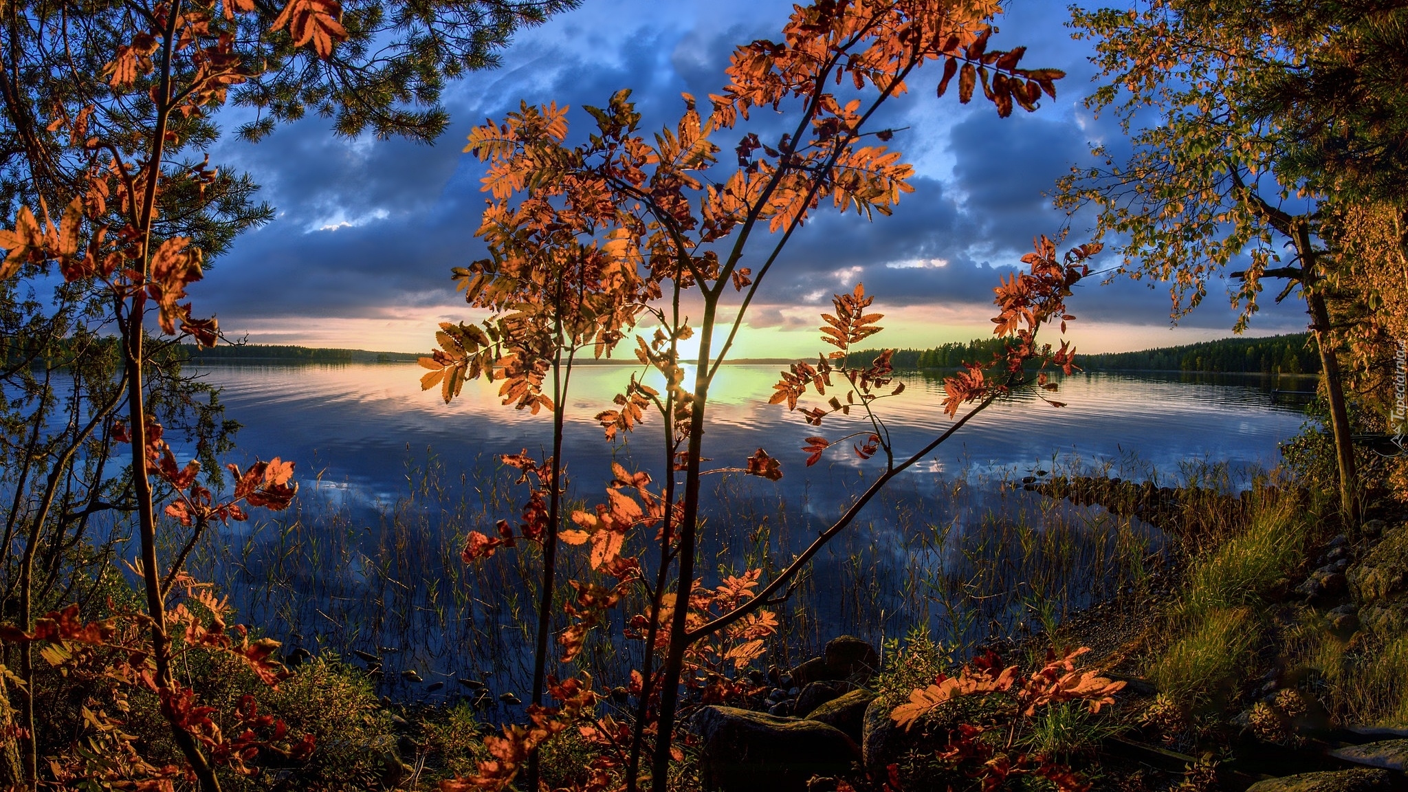 Edytor tapety: Rozświetlone porannym słońcem pożółkłe drzewa nad jeziorem