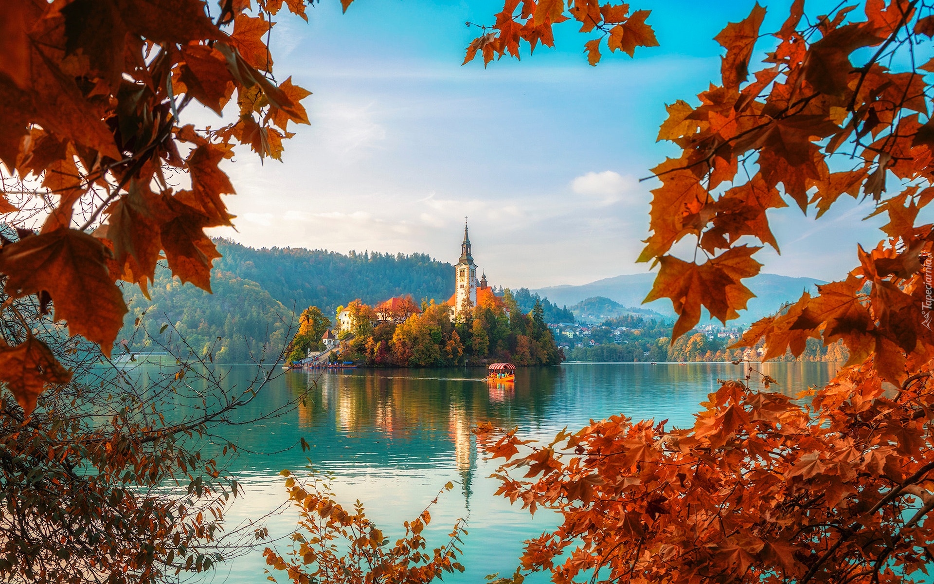 Edytor tapety: Widok zza jesiennych drzew na wyspę Blejski Otok