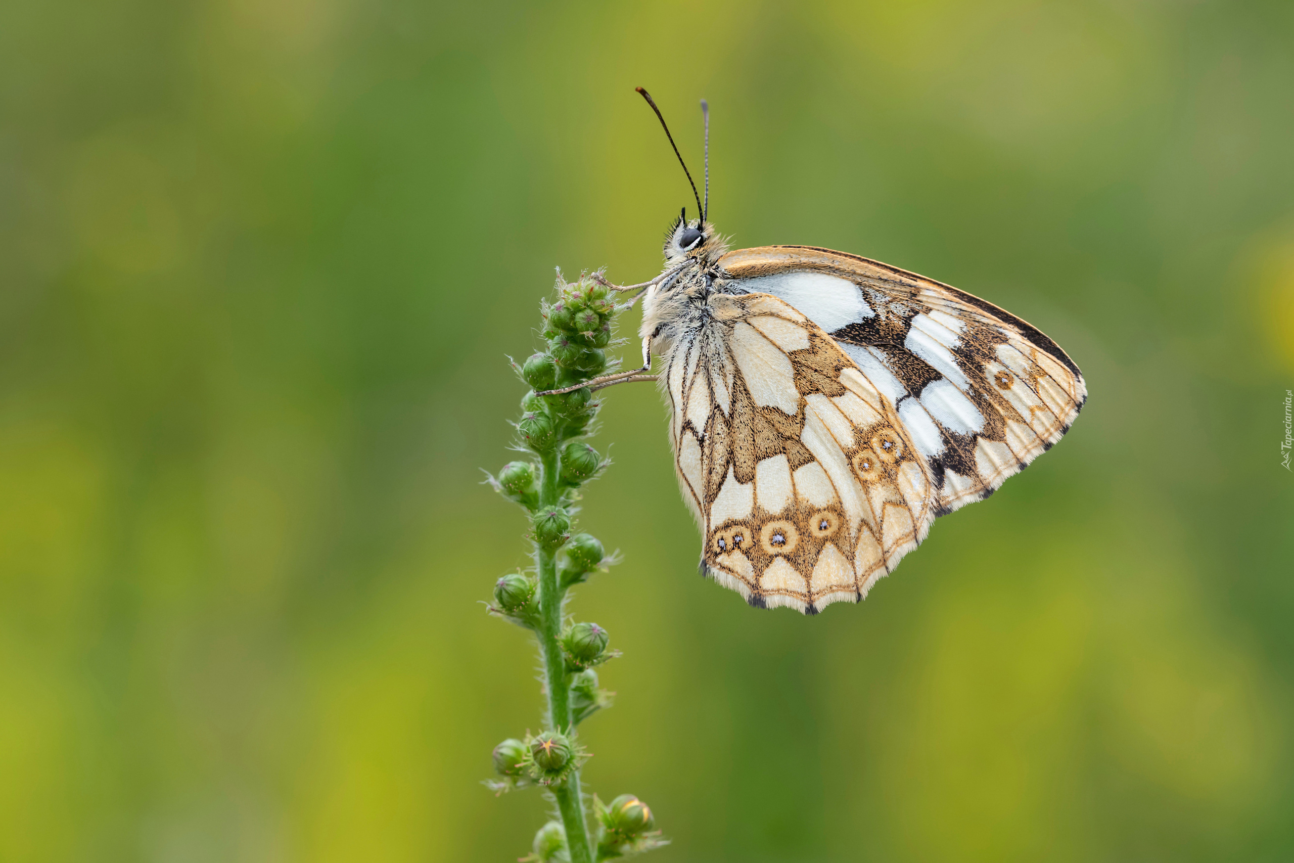 Edytor tapety: Polowiec szachownica na gałązce w zbliżeniu