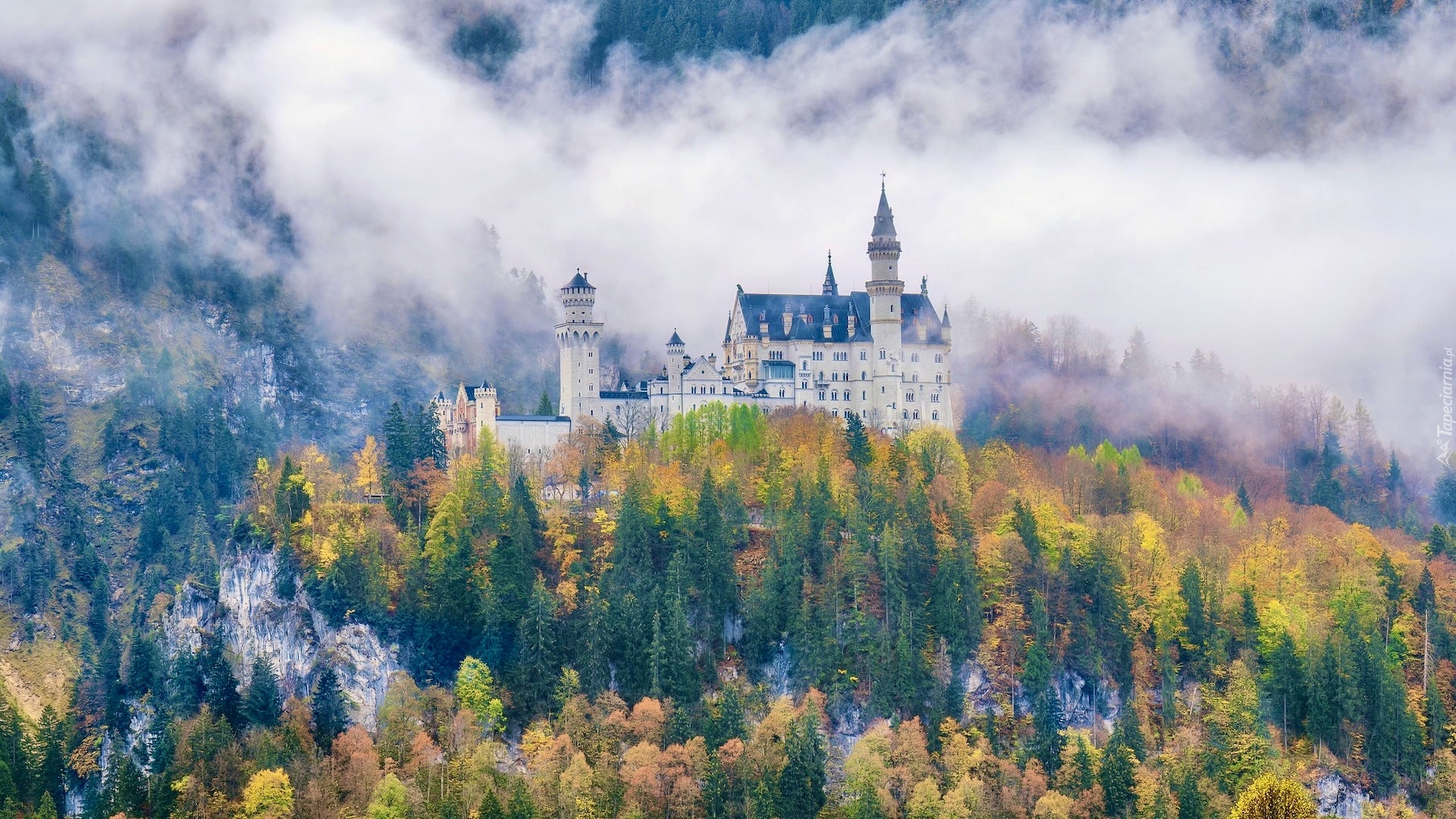 Edytor tapety: Opadająca mgła nad zamkiem Neuschwanstein