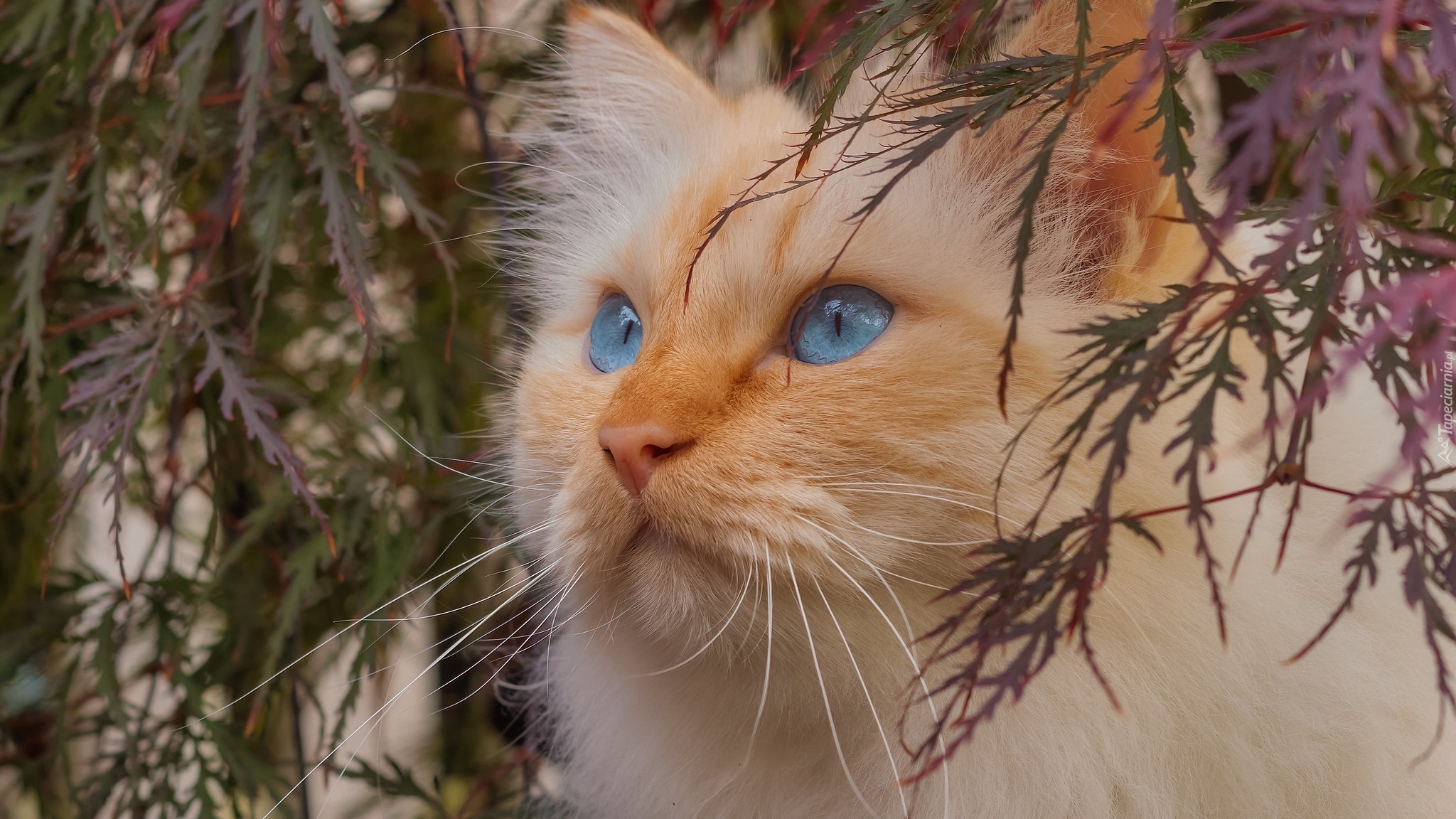 Edytor tapety: Błękitnooki kot pod gałązkami z liśćmi