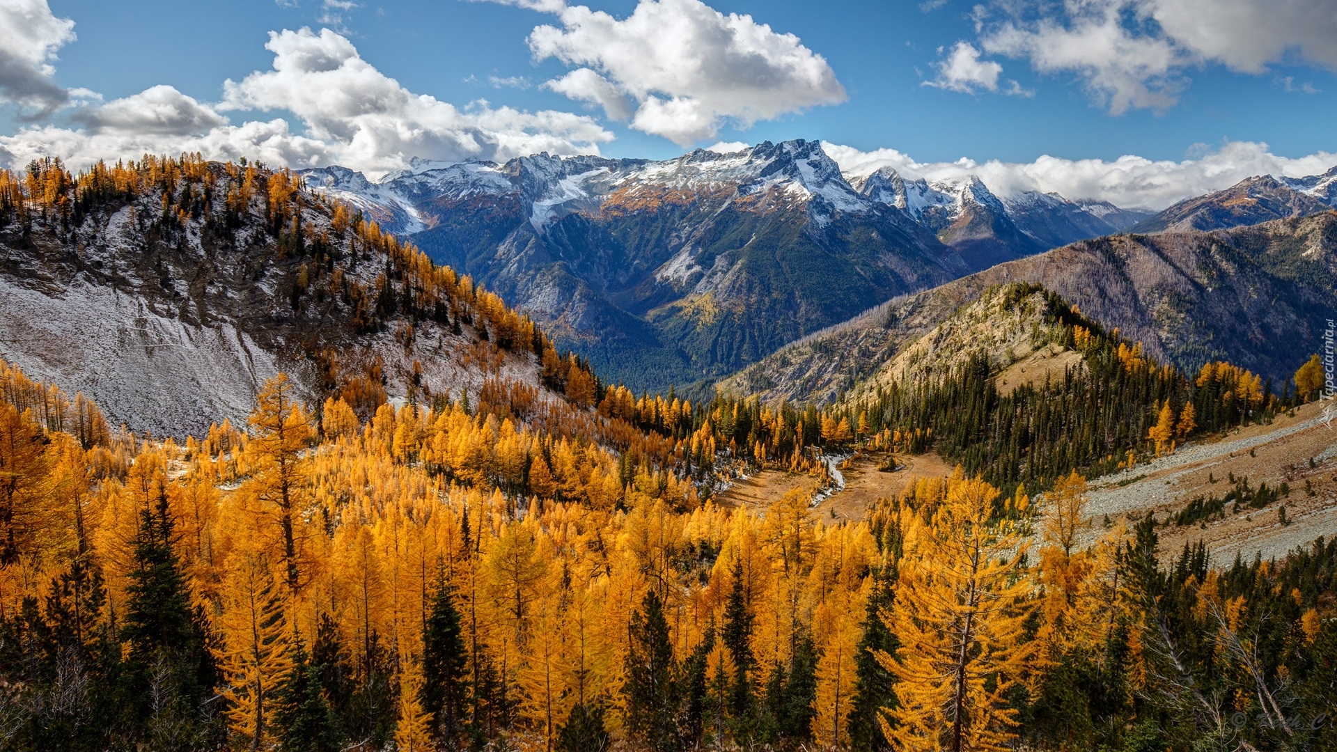 Edytor tapety: Rozświetlone pożółkłe modrzewie na tle gór