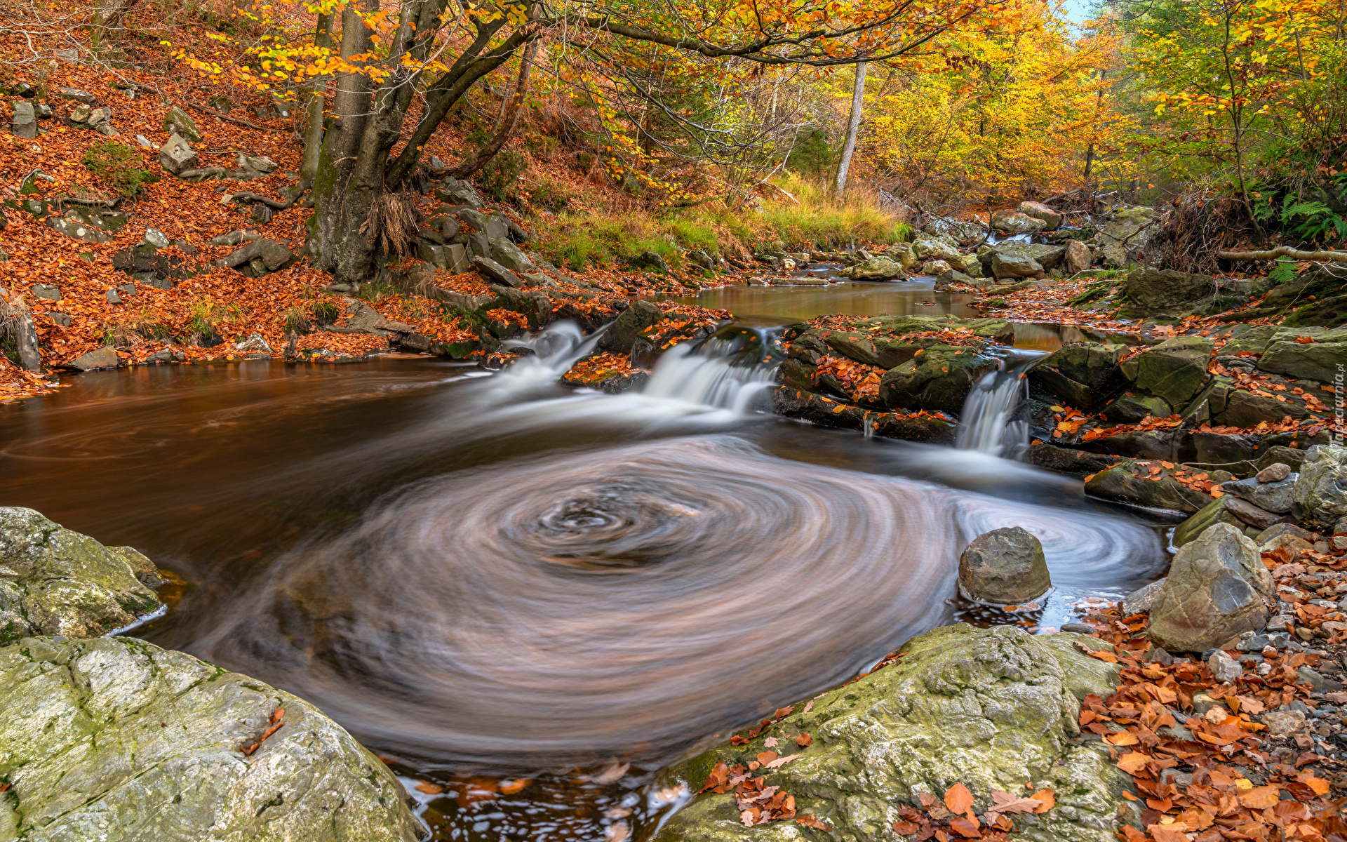Edytor tapety: Kamienie nad potokiem w jesiennym lesie
