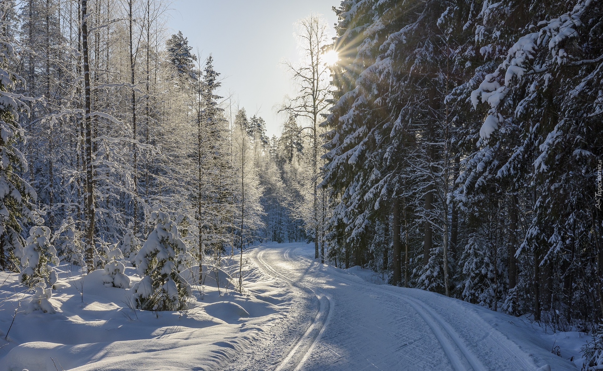 Edytor tapety: Zaśnieżone drzewa po obu stronach drogi