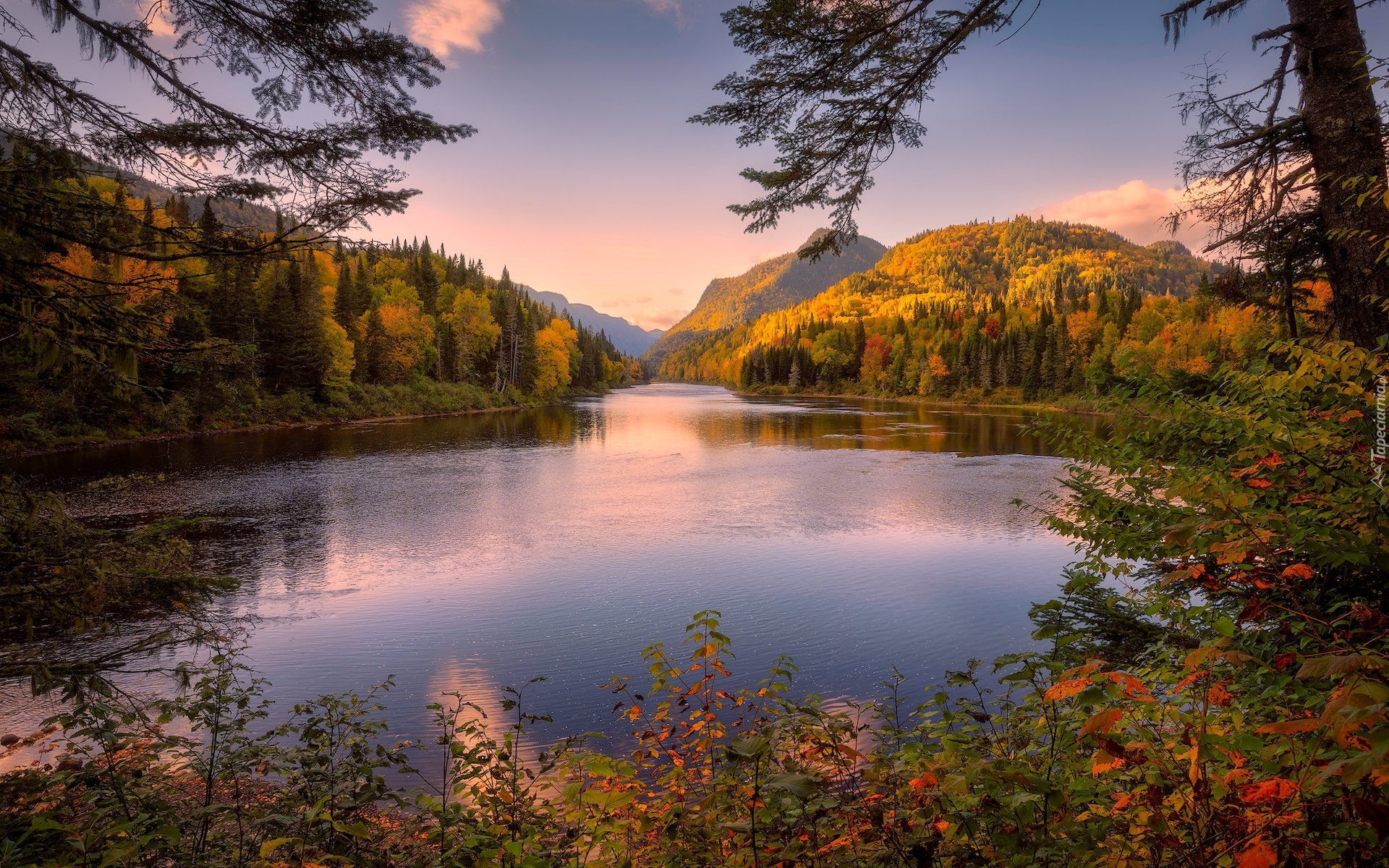 Edytor tapety: Jesienne drzewa i zalesione góry na brzegach jeziora