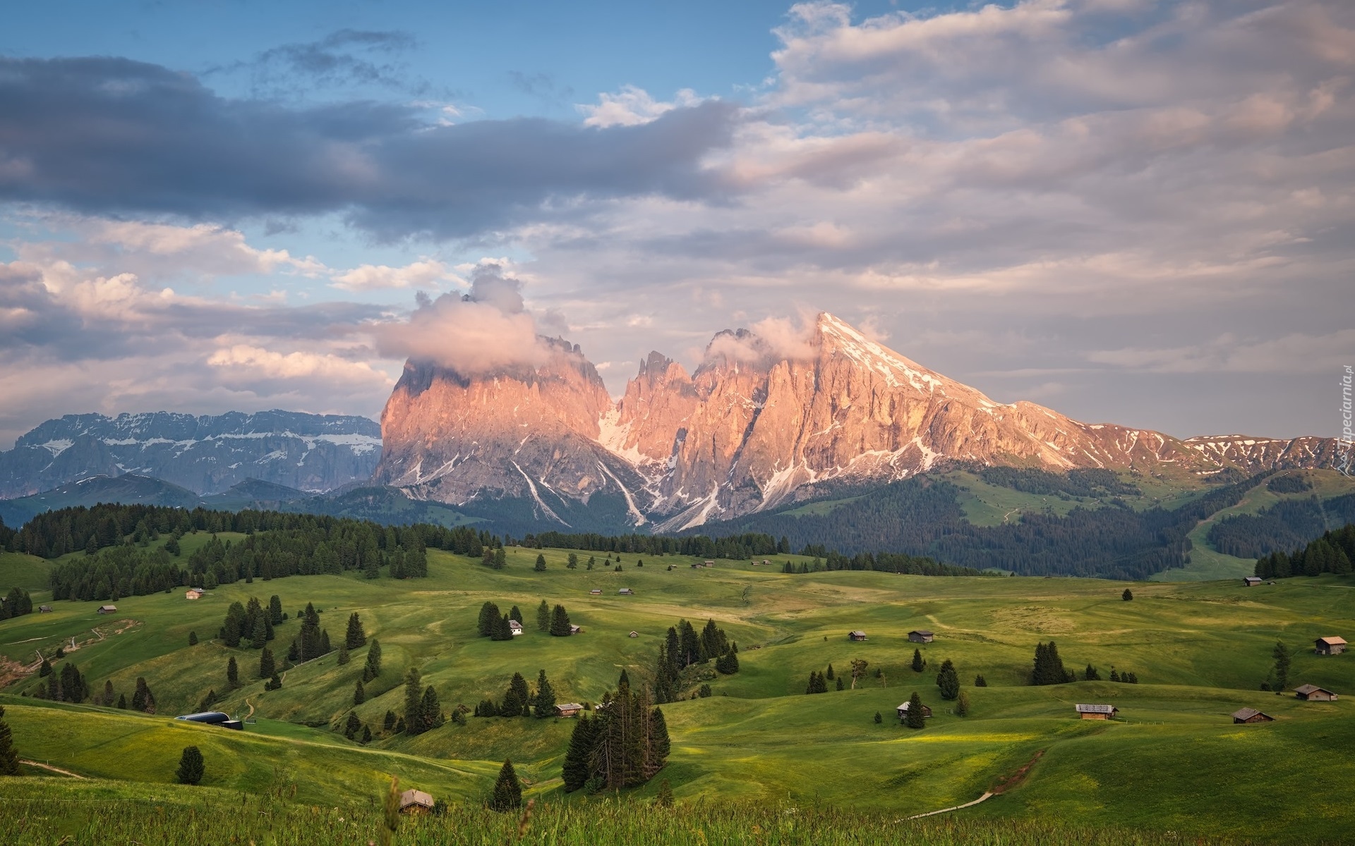 Edytor tapety: Chmury nad płaskowyżem Seiser Alm i górami Sassolungo