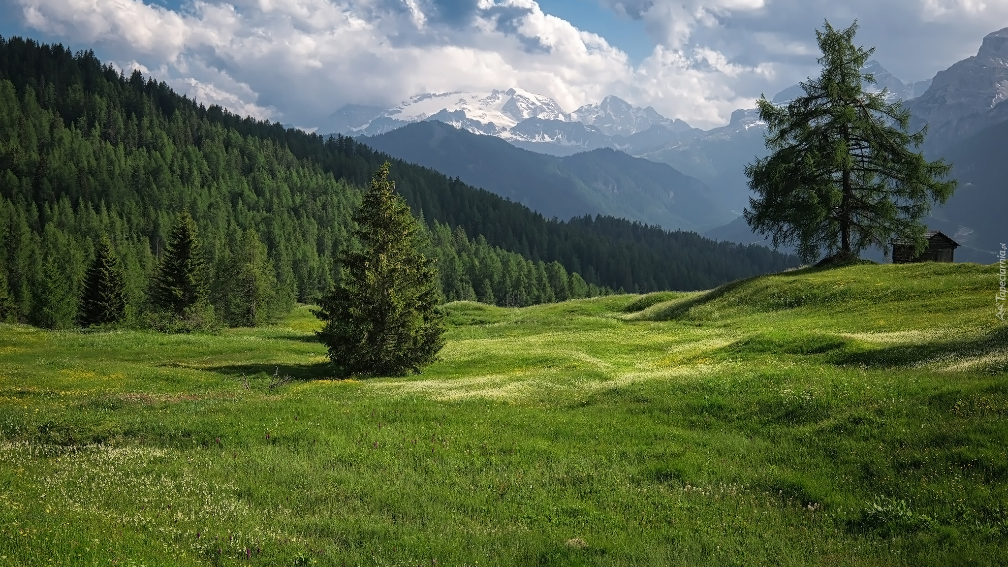Edytor tapety: Lasy i łąki Armentara na tle Dolomitów