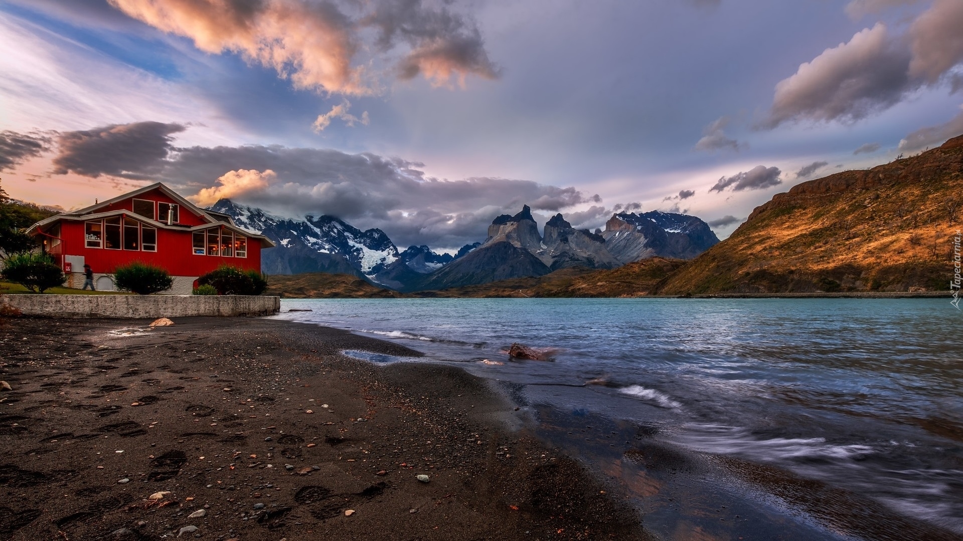 Edytor tapety: Czerwony dom nad jeziorem Lago Nordenskjold