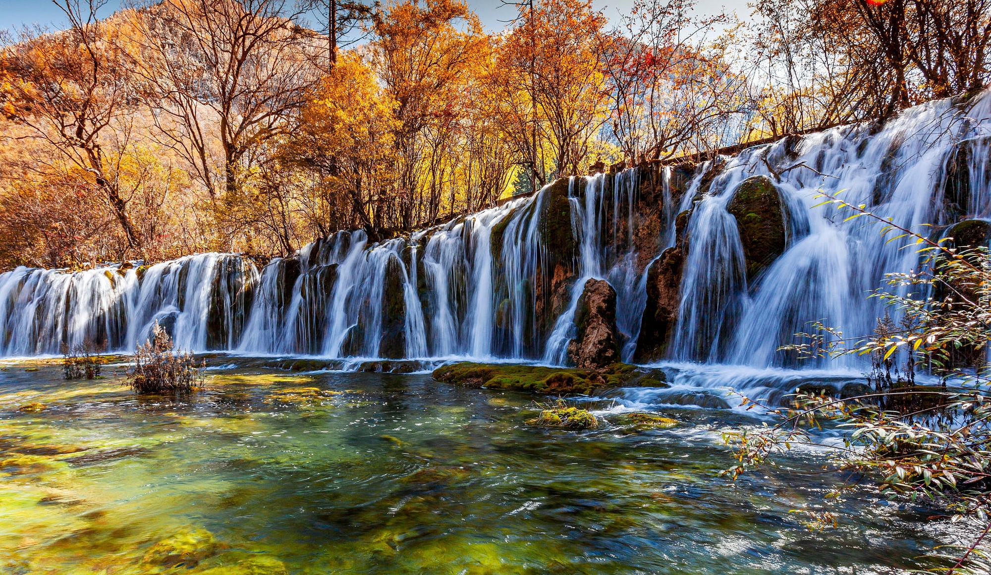 Edytor tapety: Wodospad na skałach jesienią