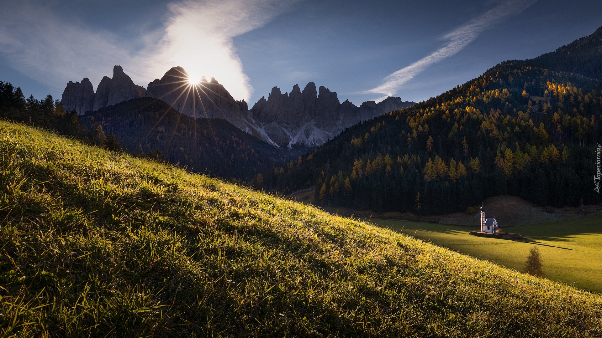 Edytor tapety: Dolina Val di Funes w słonecznym blasku jesienią