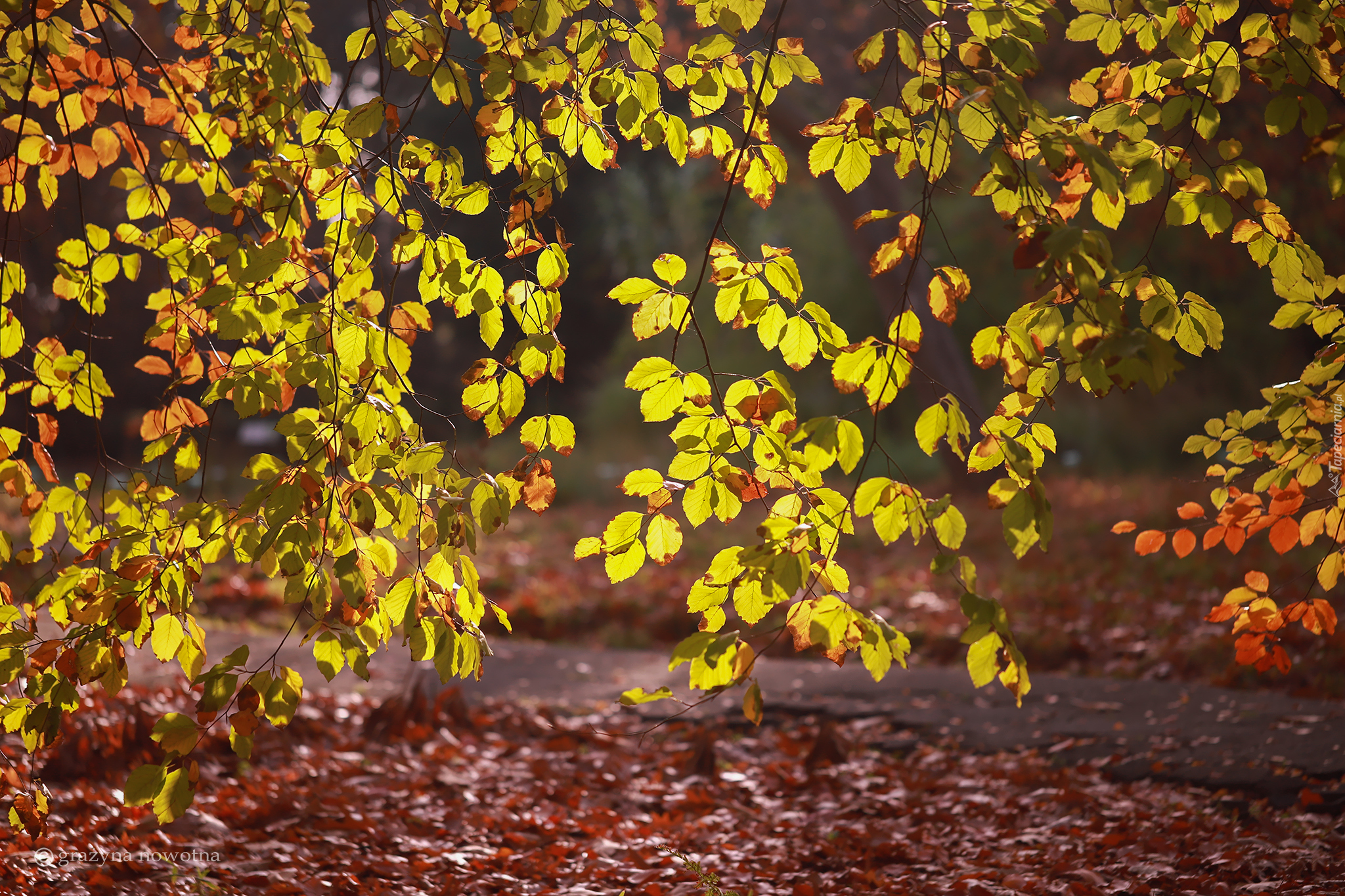 Edytor tapety: Rozświetlone słońcem jesienne liście na gałęziach