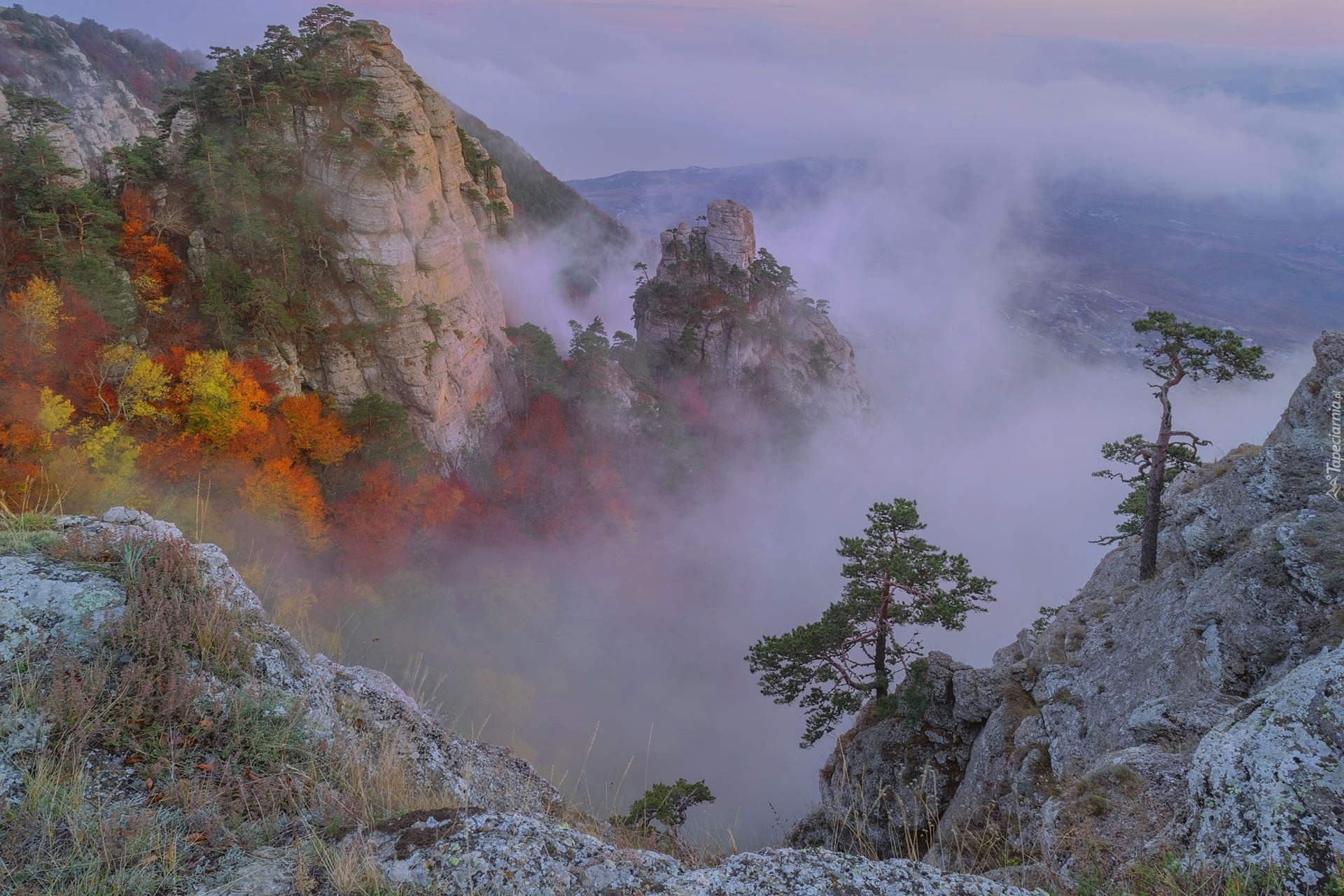 Edytor tapety: Sosny na skałach nad zamgloną doliną