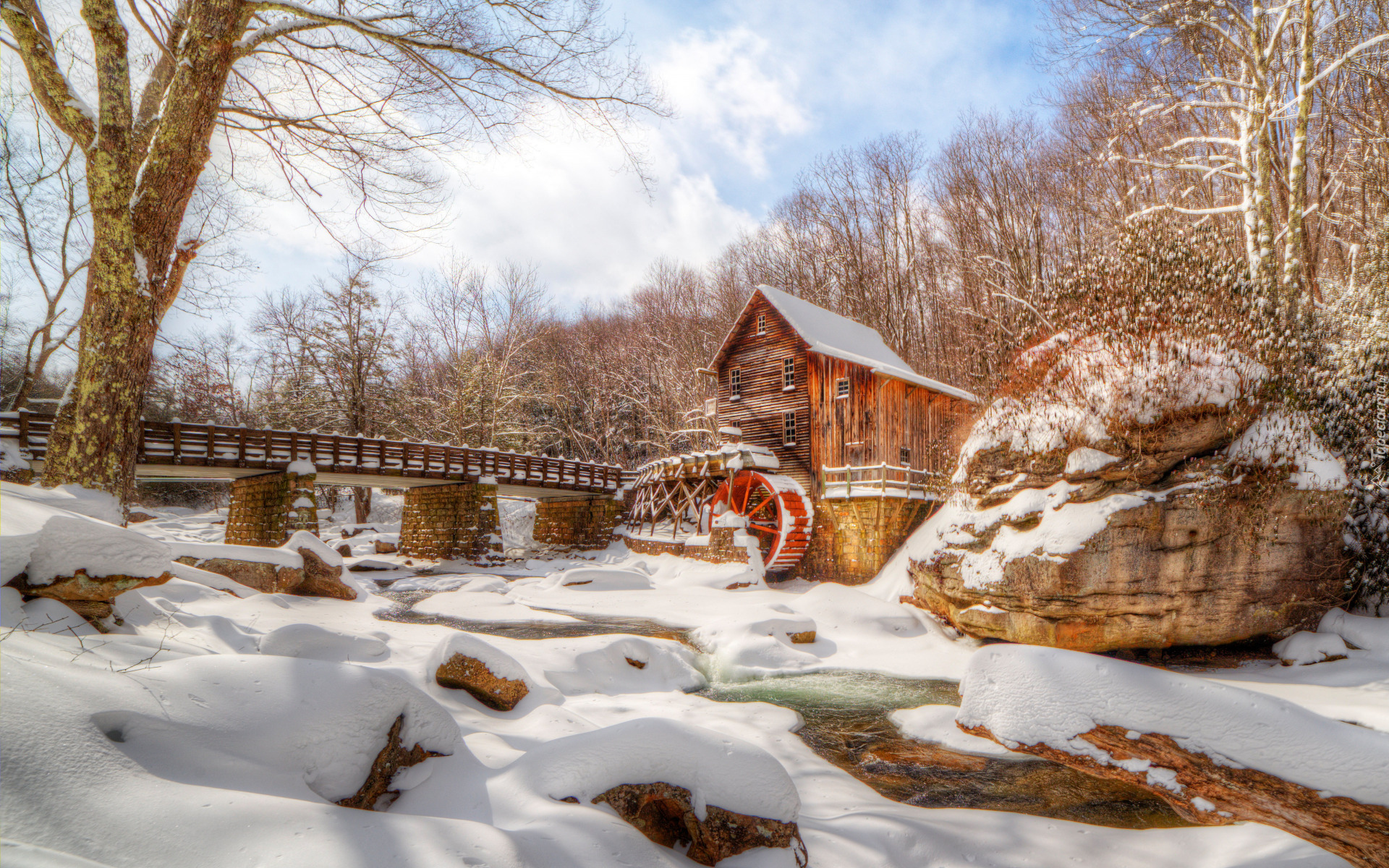 Edytor tapety: Młyn przy moście nad zamarzniętą rzeką