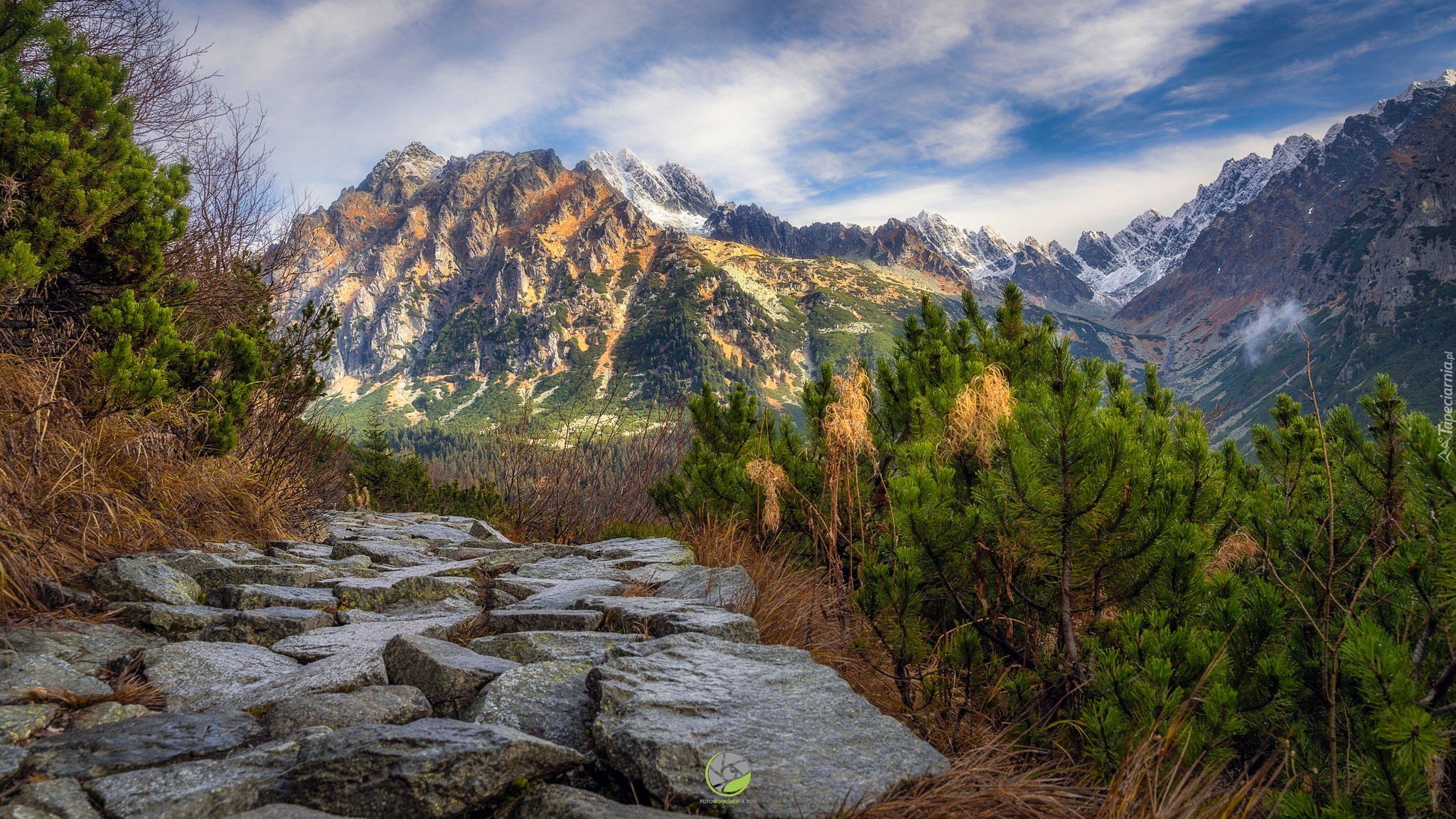 Edytor tapety: Drzewa przy kamiennej ścieżce w Tatrach