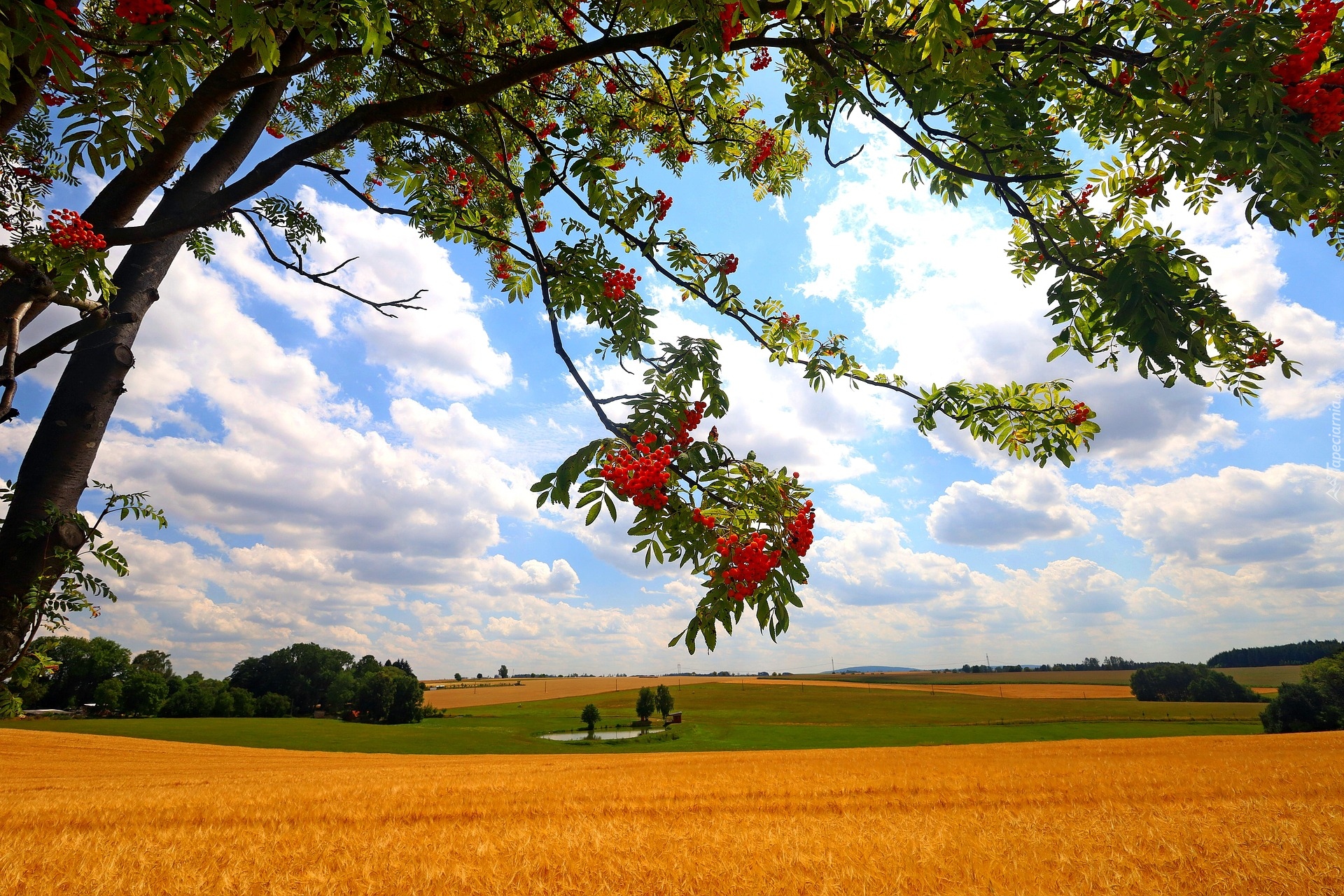 Edytor tapety: Drzewo jarzębiny obok pola dojrzałego zboża
