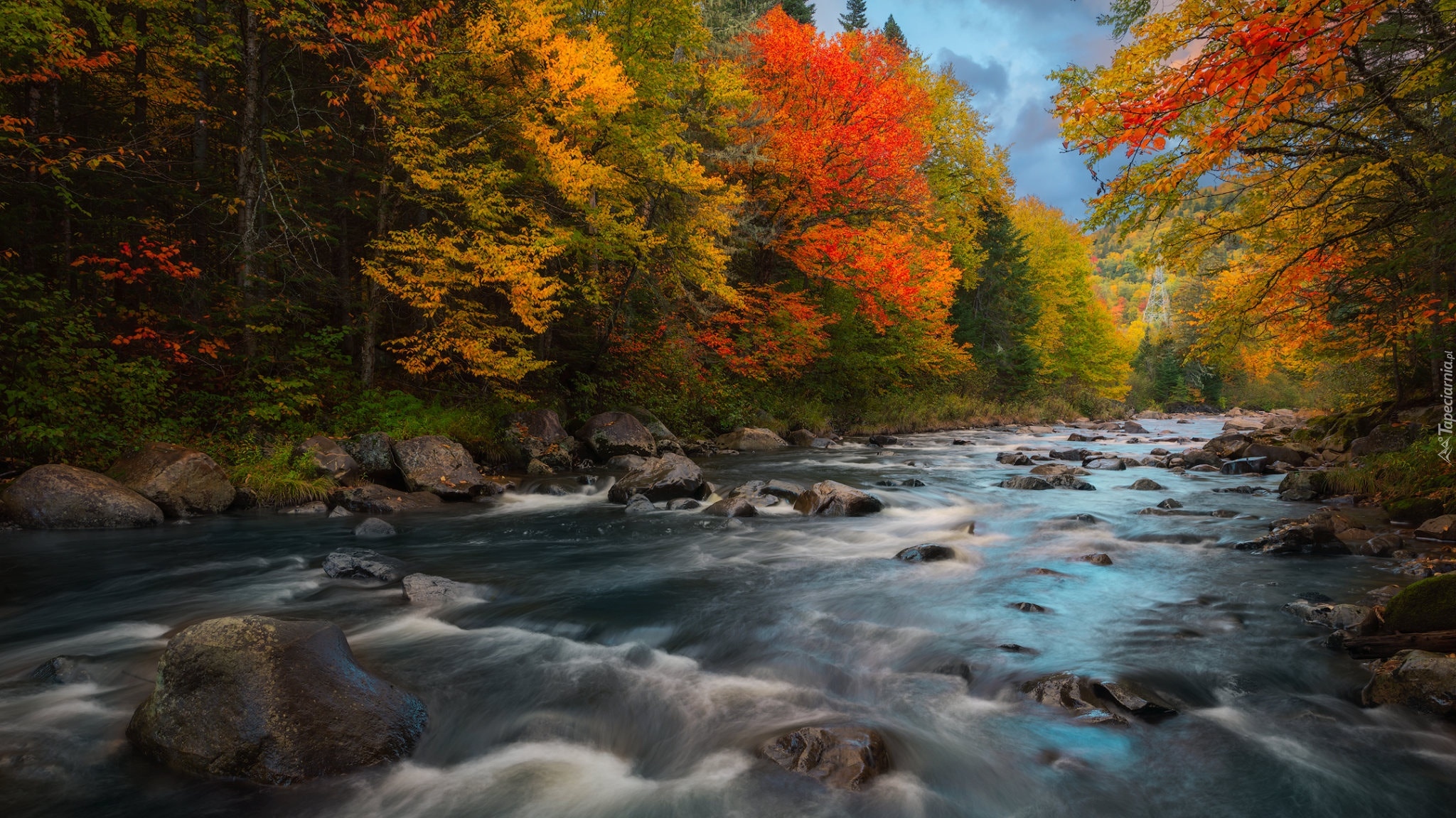 Edytor tapety: Kolorowe jesienne drzewa po obu stronach rzeki