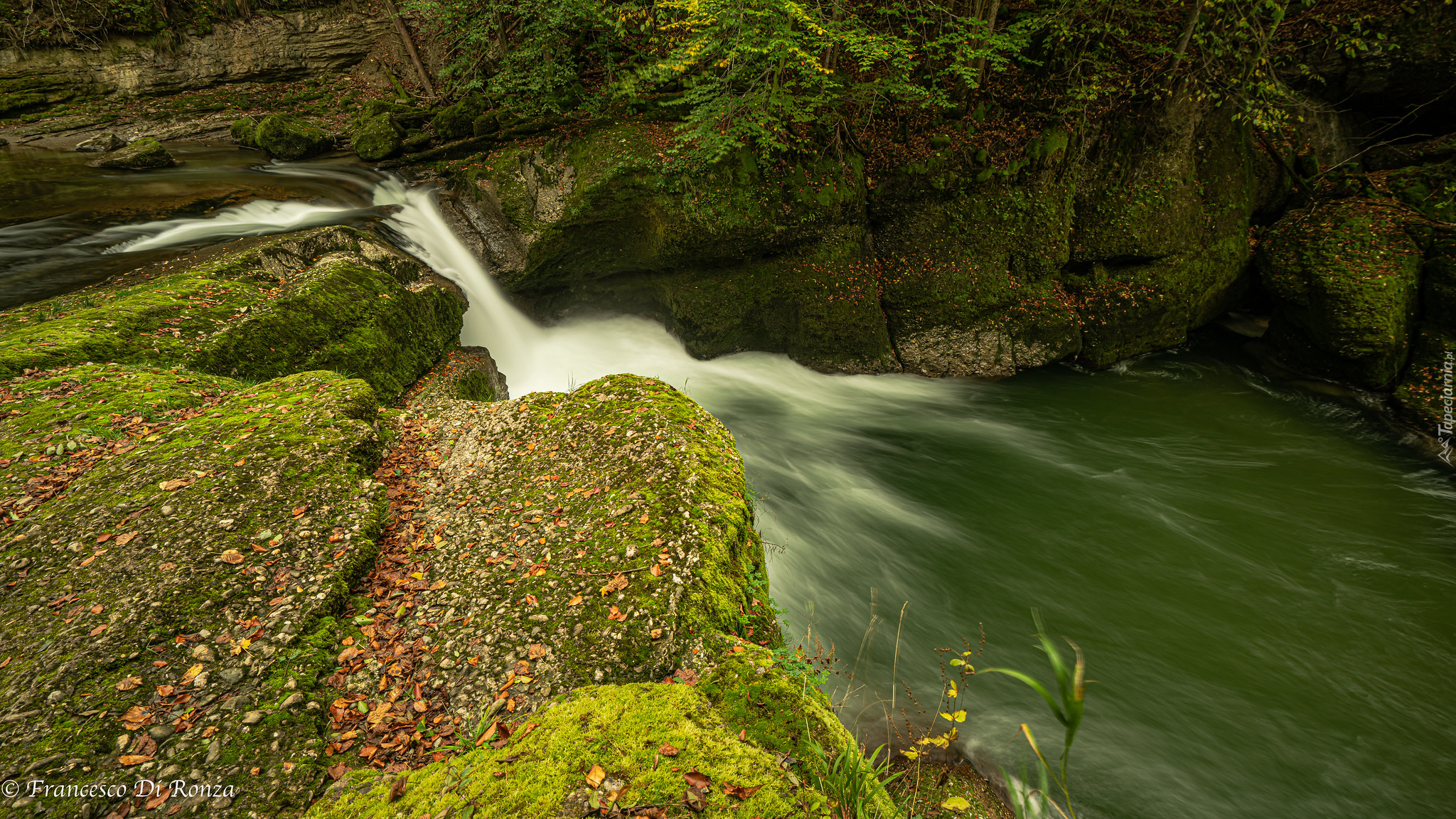 Edytor tapety: Rzeka spływająca po omszałych skałach