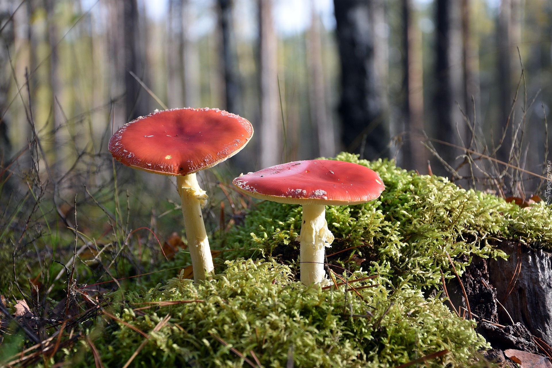Edytor tapety: Dwa muchomory czerwone w mchu