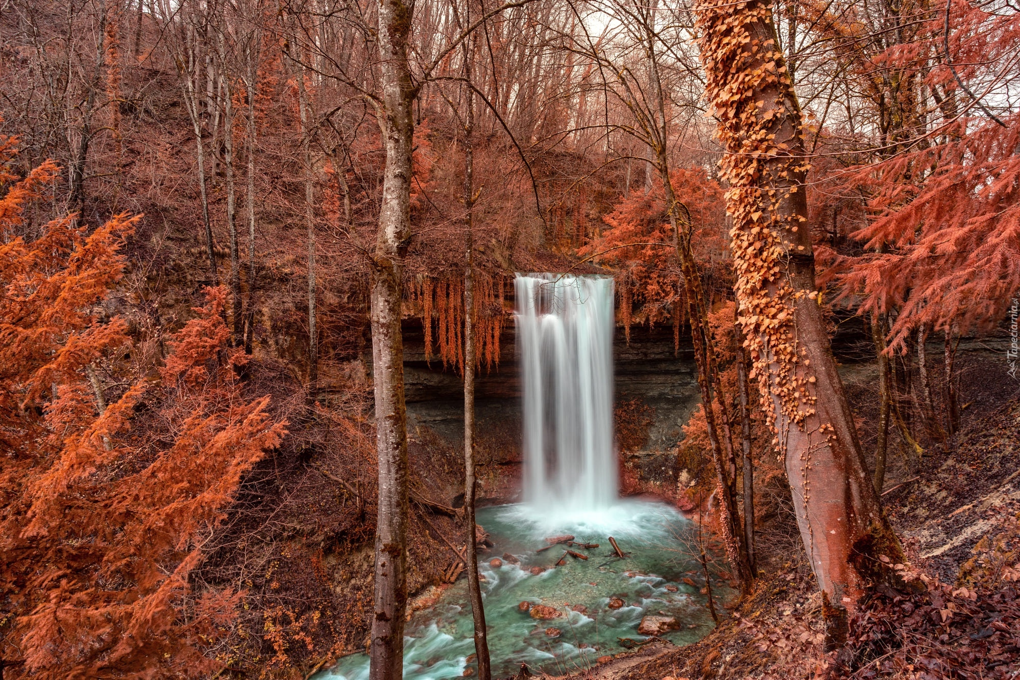 Edytor tapety: Wodospad spływający po skale w lesie jesienną porą