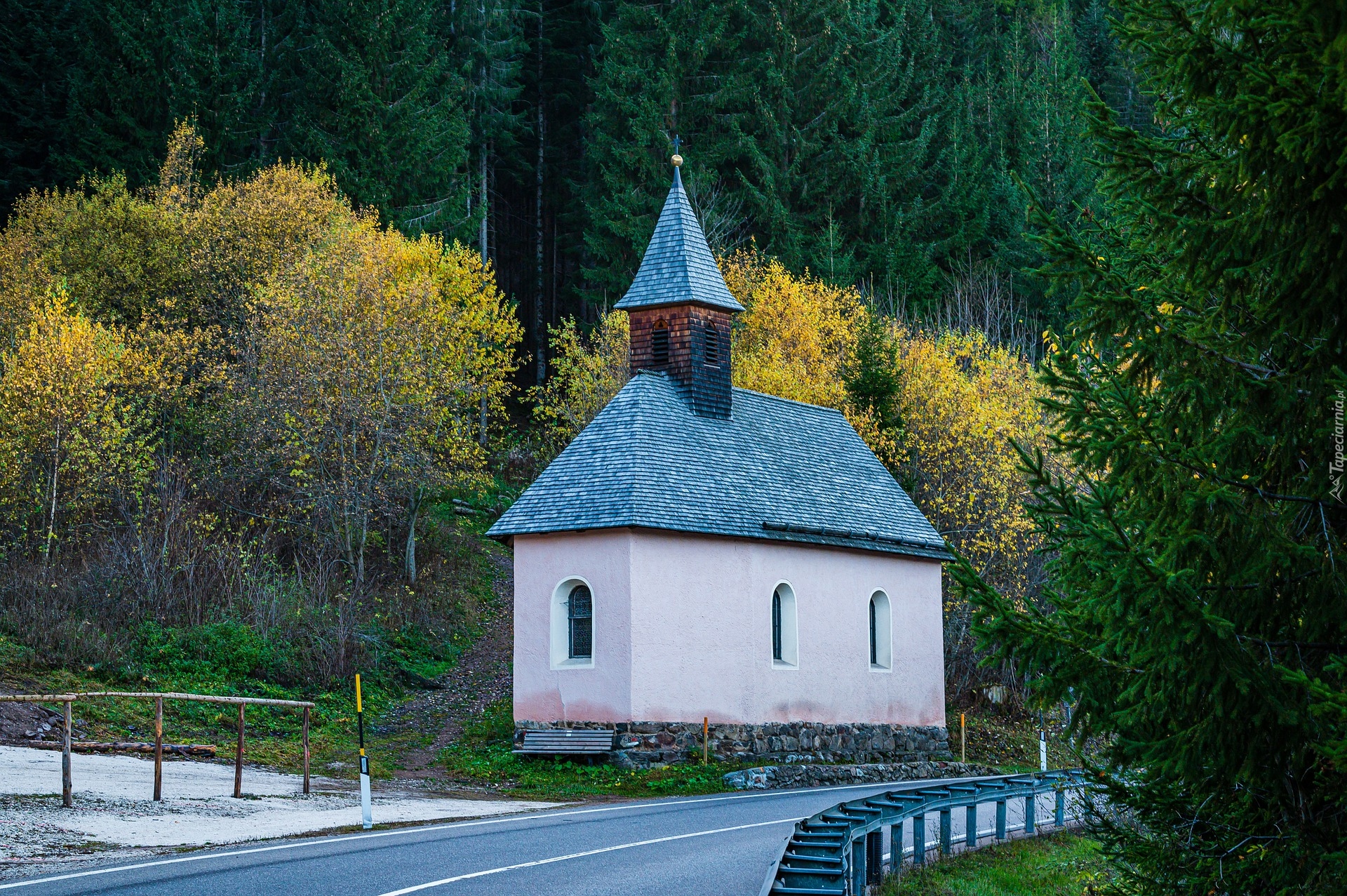 Edytor tapety: Kapliczka i pożółkłe drzewa przy drodze pod lasem