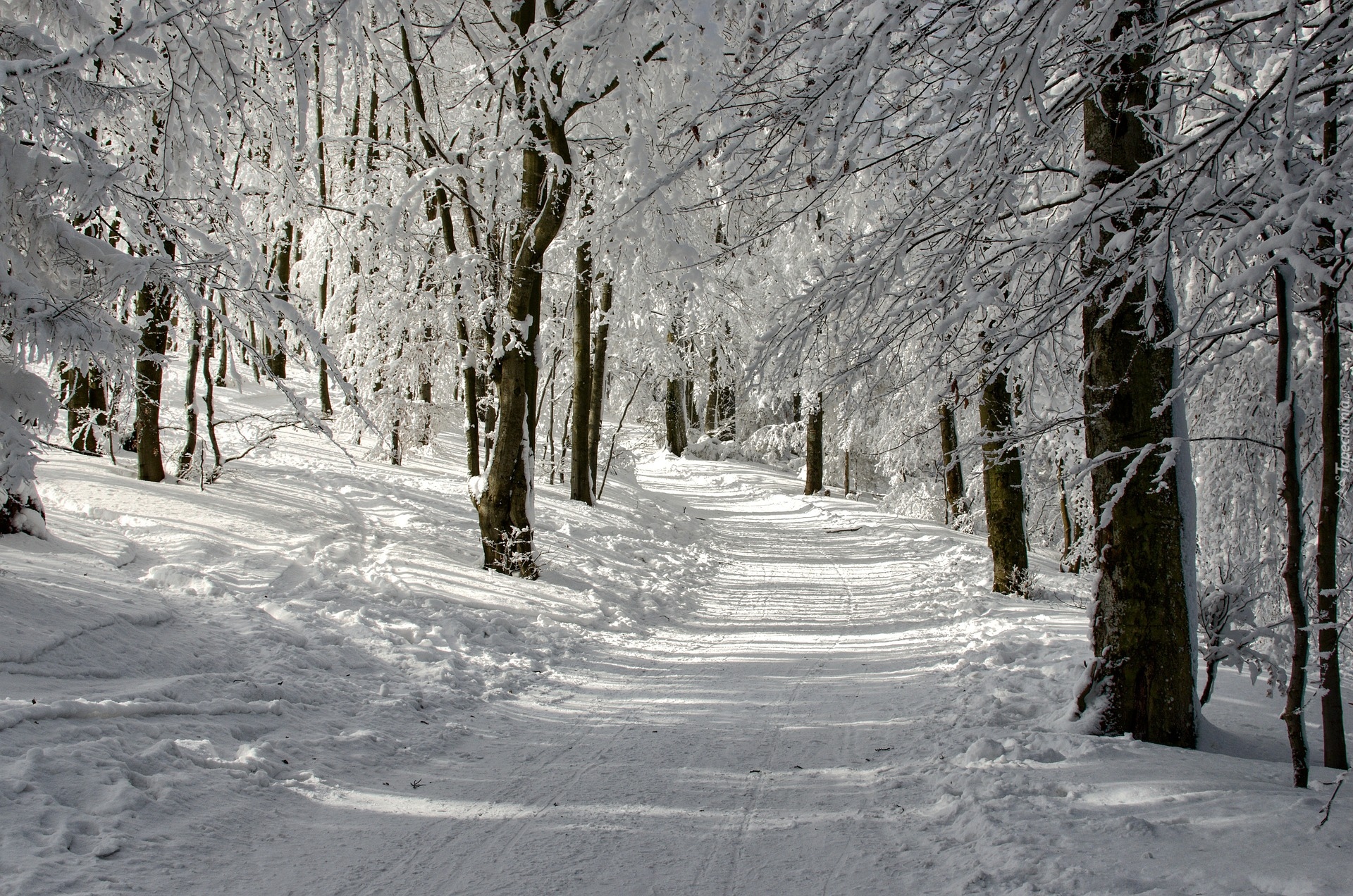 Edytor tapety: Ośnieżona droga i drzewa w słonecznym zimowym lesie