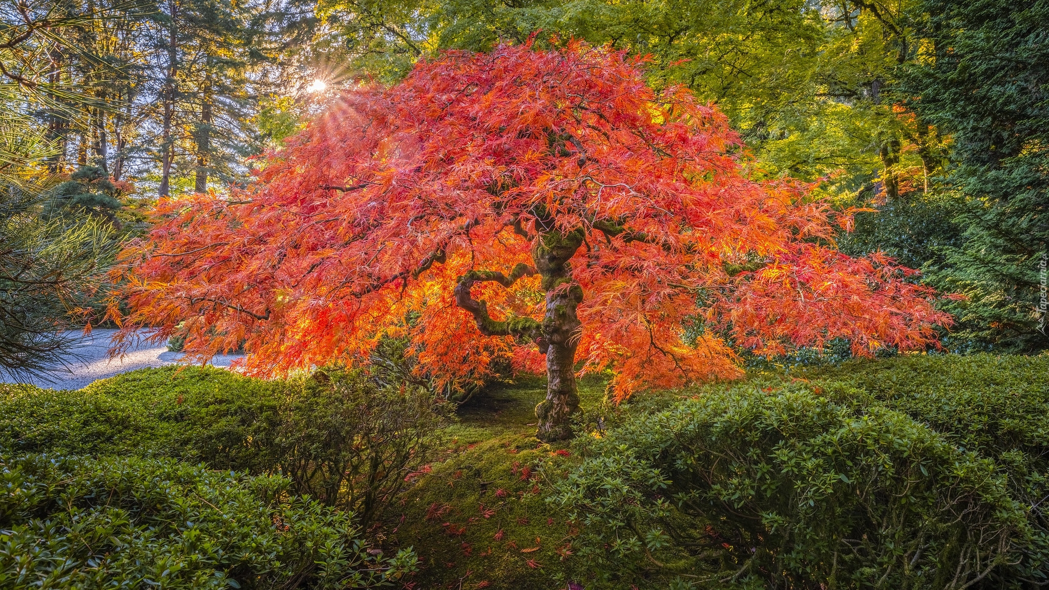 Edytor tapety: Rozświetlony słońcem jesienny klon palmowy w ogrodzie