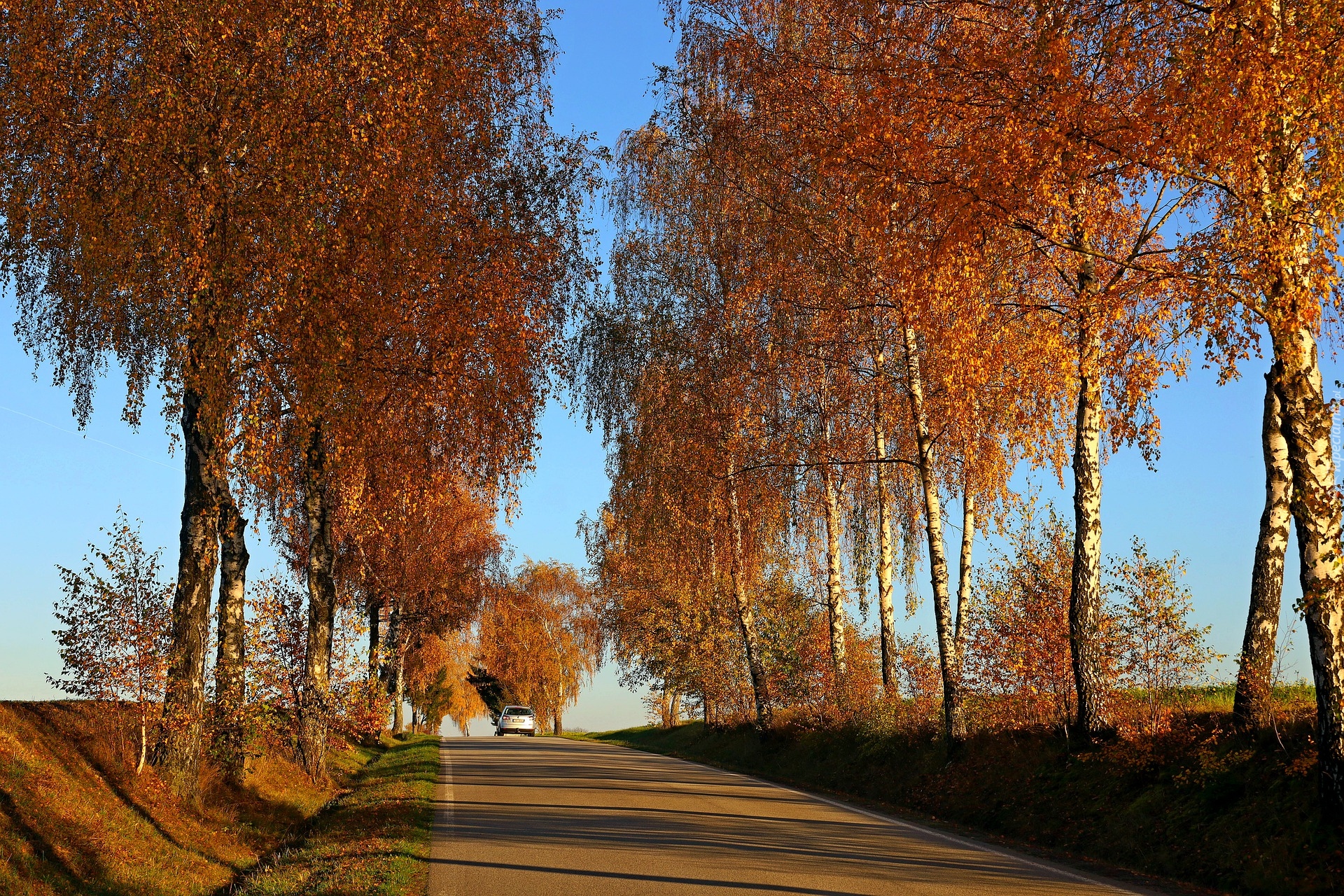 Edytor tapety: Rozświetlone słońcem jesienne brzozy po obu stronach drogi