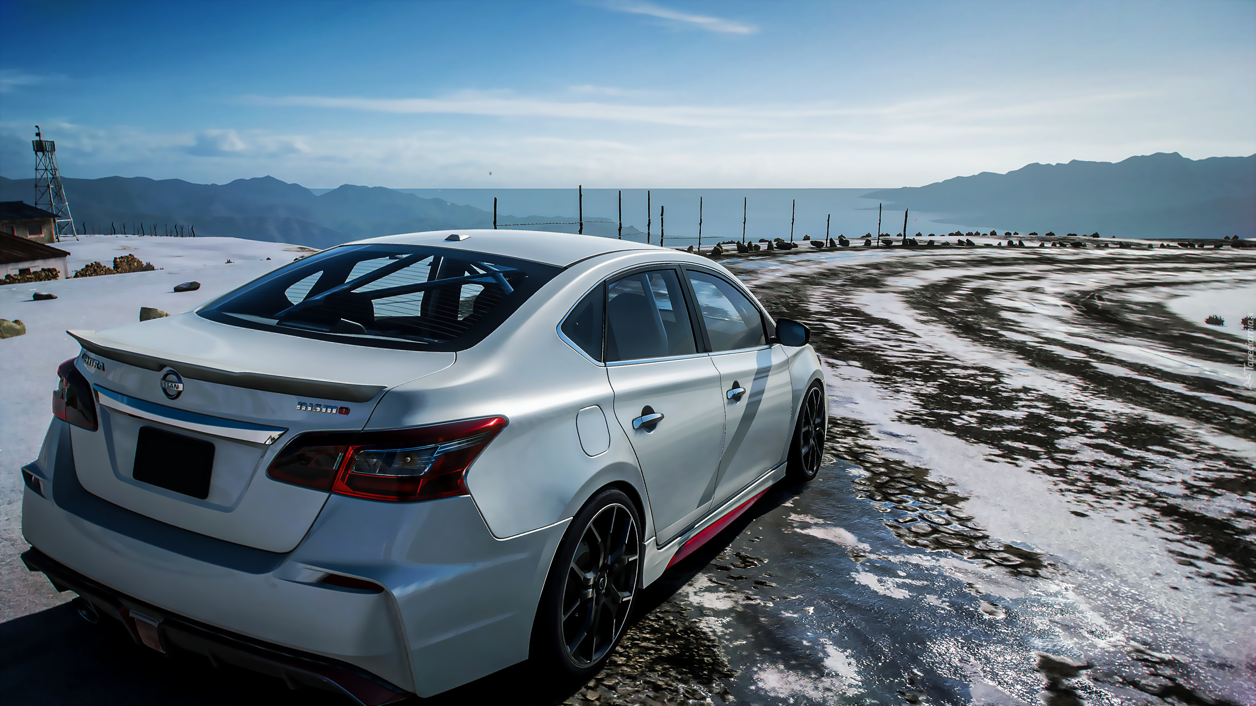 Edytor tapety: Biały Nissan Sentra z gry Forza Horizon 5