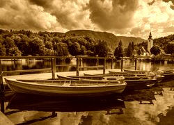 Edytor tapety: Łódki przy pomoście i kościół nad jeziorem Bohinj w Słowenii