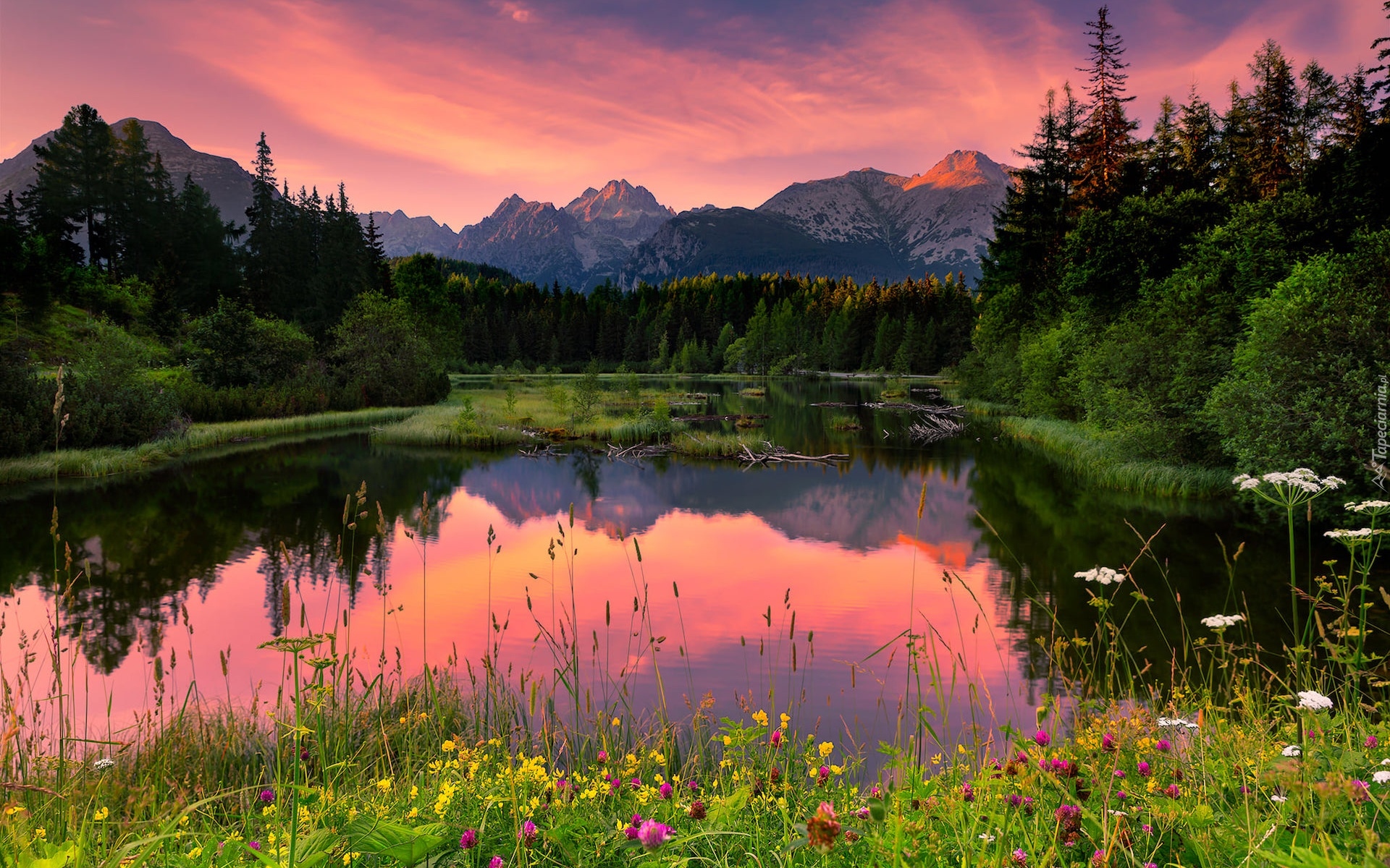 Edytor tapety: Zaróżowione niebo nad Jeziorem Szczyrbskim w Tatrach Słowackich