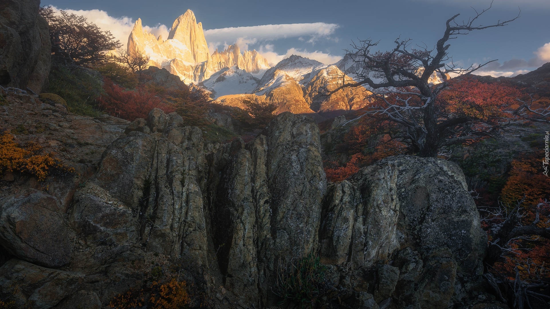 Edytor tapety: Widok zza skał na rozświetloną górę Fitz Roy