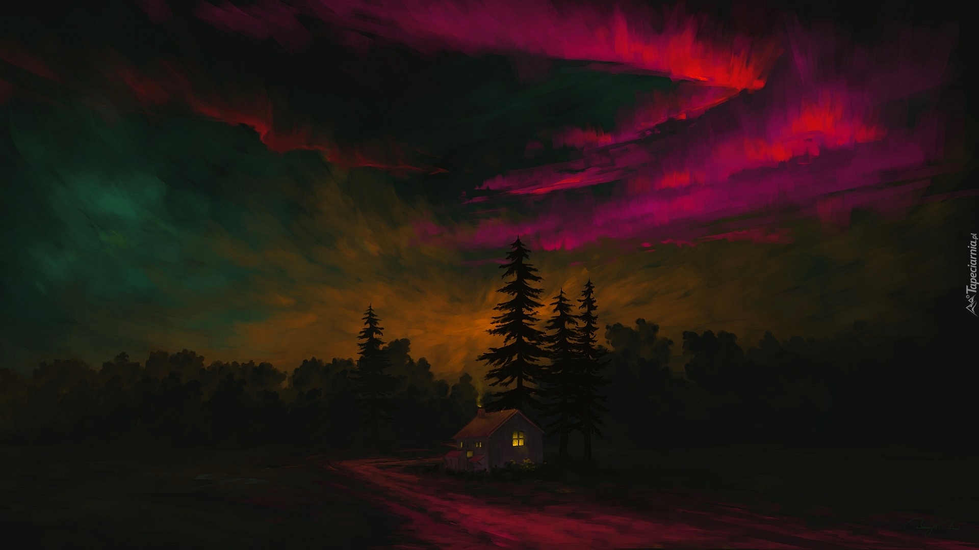 Edytor tapety: Zorza polarna nad domem i drzewami przy drodze