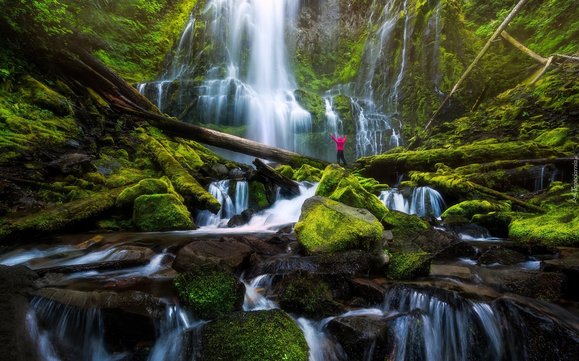 Edytor tapety: Człowiek na kłodzie przy wodospadzie Proxy Falls