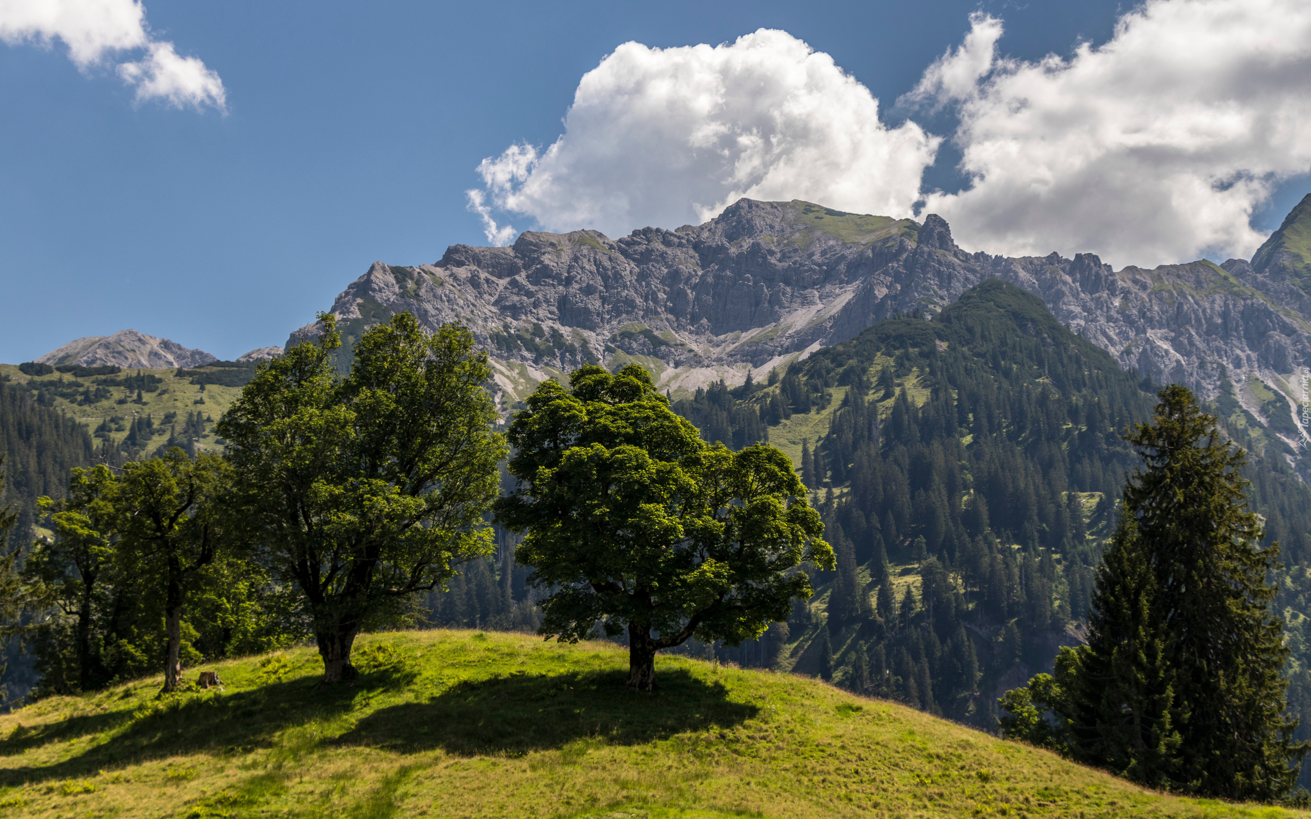Edytor tapety: Drzewa na wzgórzu z widokiem na góry