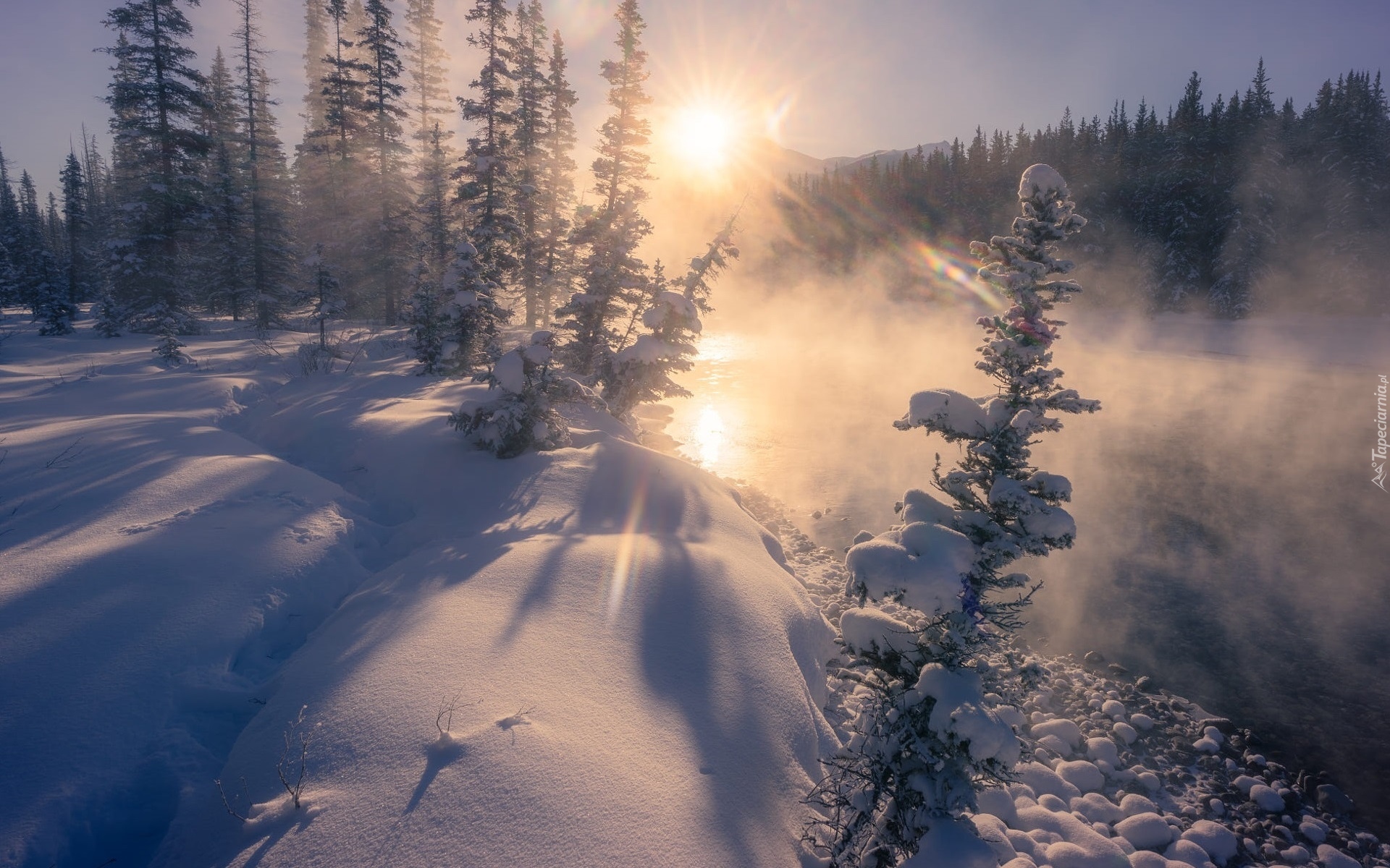 Edytor tapety: Drzewa w zaspach nad zamgloną rzeką
