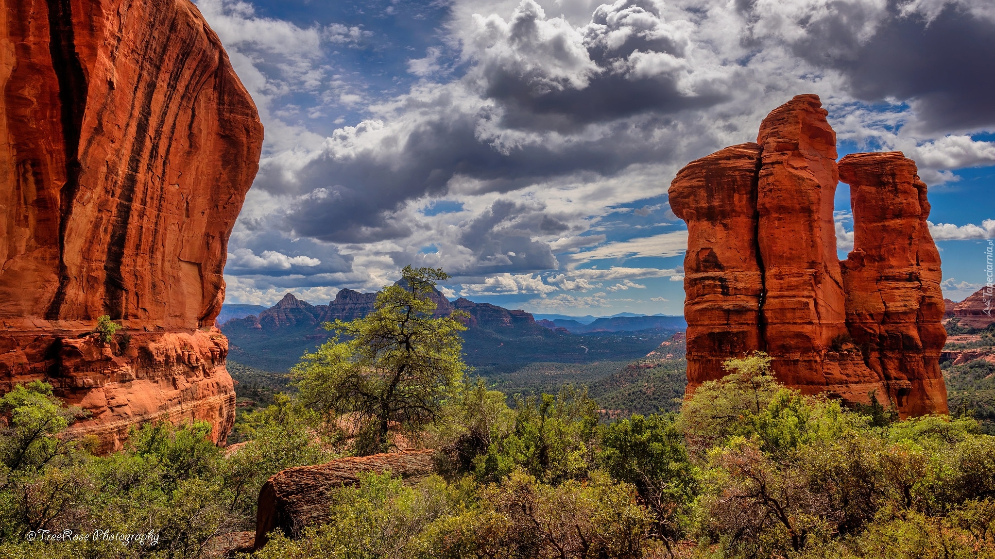 Edytor tapety: Krzewy przy czerwonych skałach w Sedonie