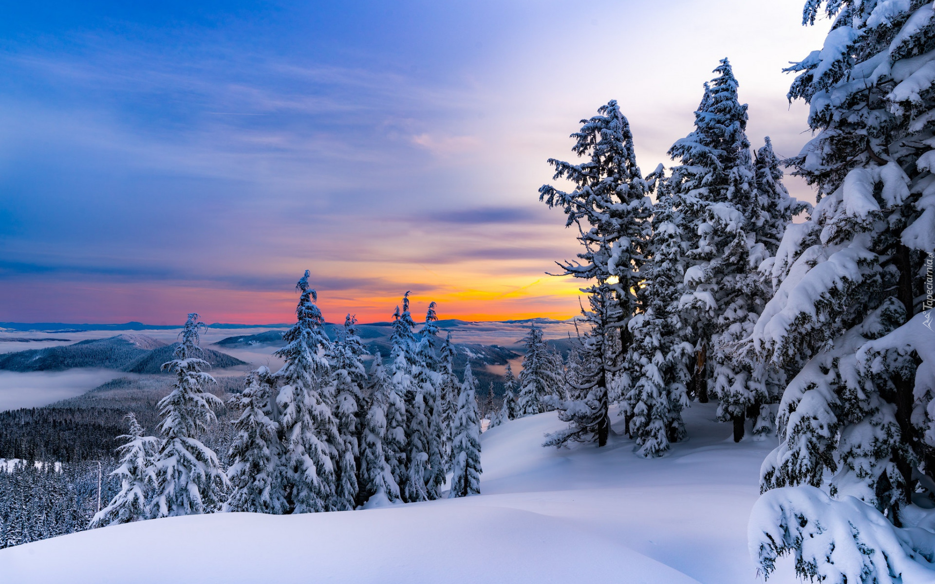 Edytor tapety: Drzewa w zaspach na tle kolorowego nieba