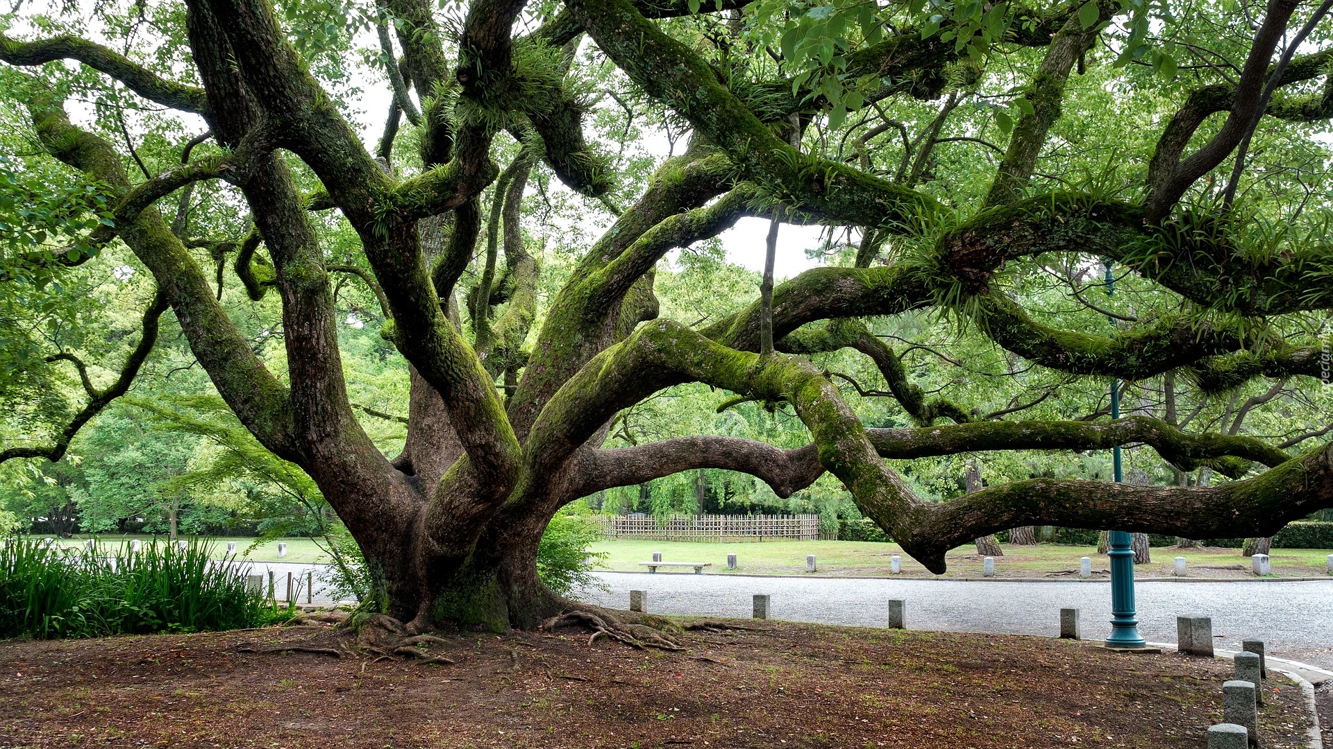 Edytor tapety: Rozłożyste drzewo z wykrzywionymi konarami w parku