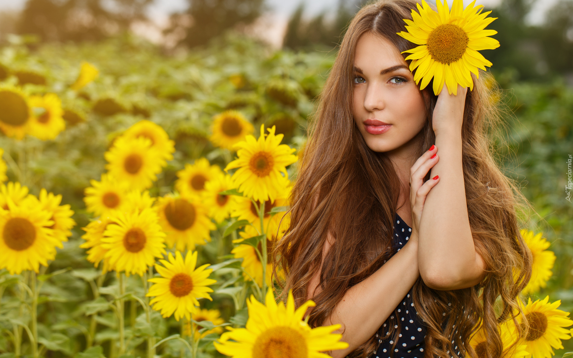 Edytor tapety: Długowłosa dziewczyna wśród słoneczników