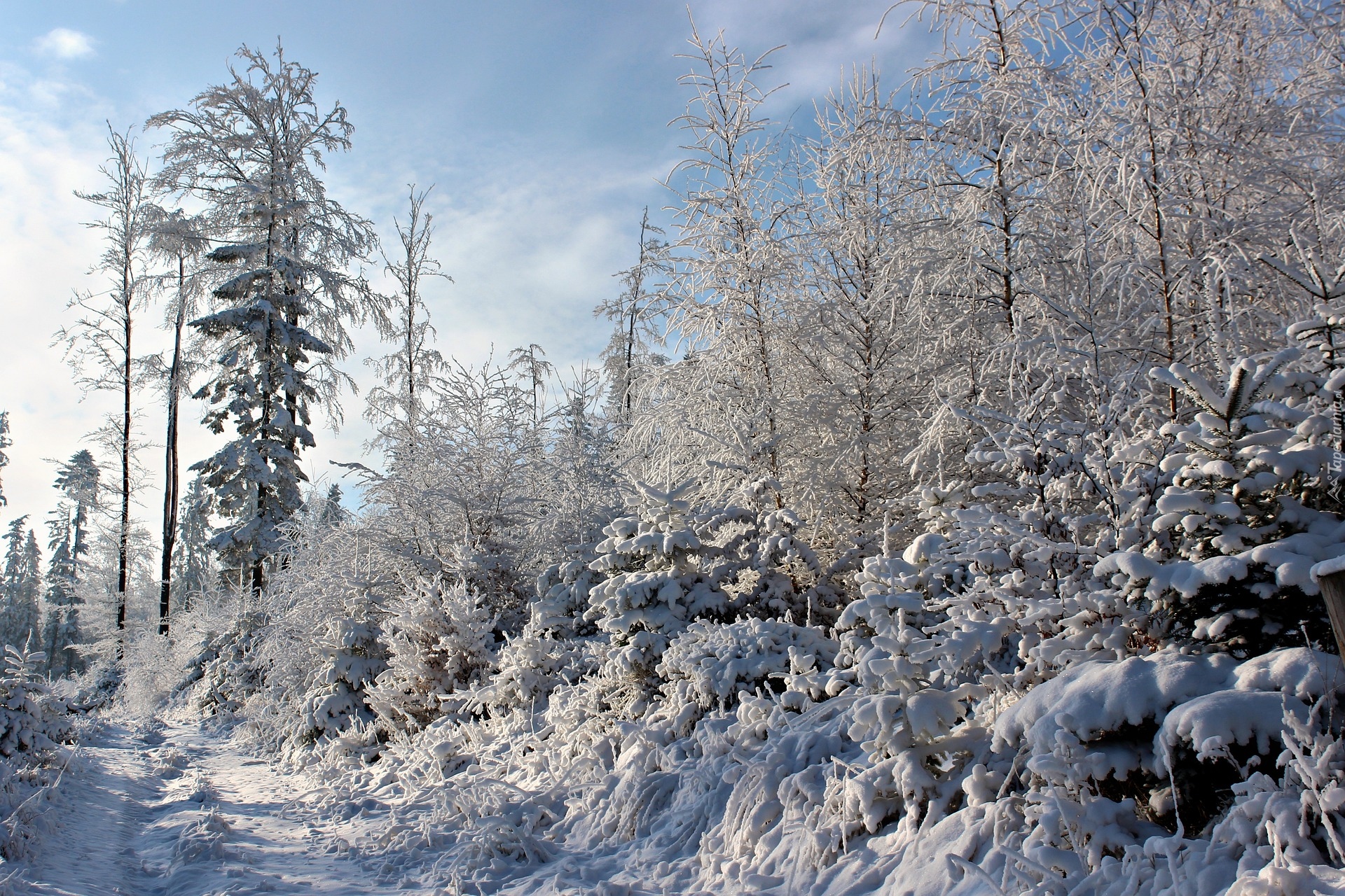 Edytor tapety: Leśna droga pośród zaśnieżonych drzew