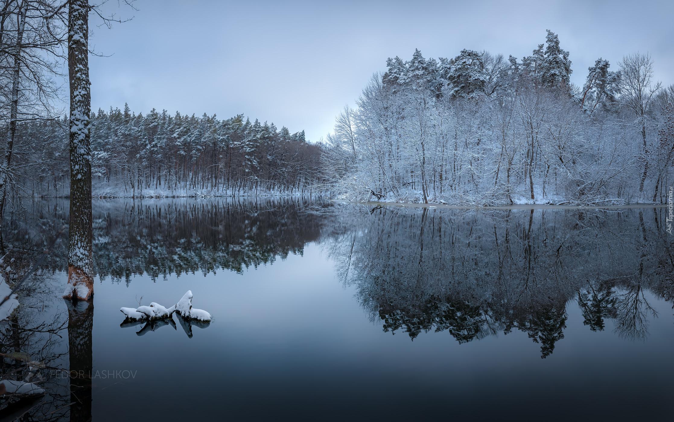 Edytor tapety: Lekko ośnieżone drzewa nad jeziorem